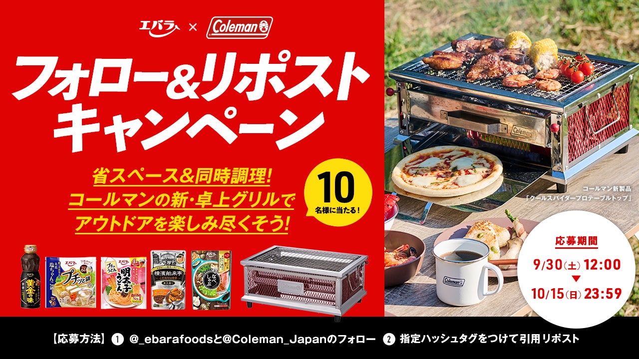コールマンとのコラボレーションを記念して、X(旧Twitter)にてコールマン「クールスパイダープロテーブルトップ」と当社の「黄金の味」などの商品詰め合わせセットが抽選で10名様に当たる、「エバラ×コールマン コラボキャンペーン」を実施します。本キャンペーンは2023年9月30日(土)より応募開始となります。