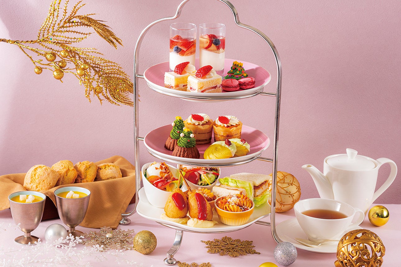 クリスマスツリーに見立てた「ショコラ風味のタルトレットに抹茶ガナッシュ」や、クラシカルな「ストロベリーショートケーキ」、クリスマスリースを連想させる「ホワイトチョコにドライ苺をのせたピスタチオクッキー」や「キャラメル林檎マフィンにクレームバニーユ絞り」など、クリスマスシーズンを彩るスイーツの数々が、3段スタンドで優雅なクリスマスを演出します。セイボリーには「ポークロースカツとレタスのサンドウィッチ」や「牛肉のラグーソースパスタ」などが並び、少し遅めのランチとしてもお楽しみいただけます。