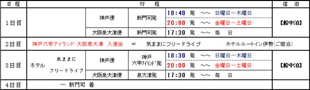 SHKグループの旅行会社、株式会社ヴィーナストラベル(本社:大阪府大阪市、代表取締役:池田恒雄)は北九州・新門司港⇔大阪泉大津港または神戸六甲アイランド港の往復「阪九フェリー」を利用し、往復フェリー乗船代・乗用車航送代と現地1泊宿泊代がセットになったマイカープランを販売いたします。