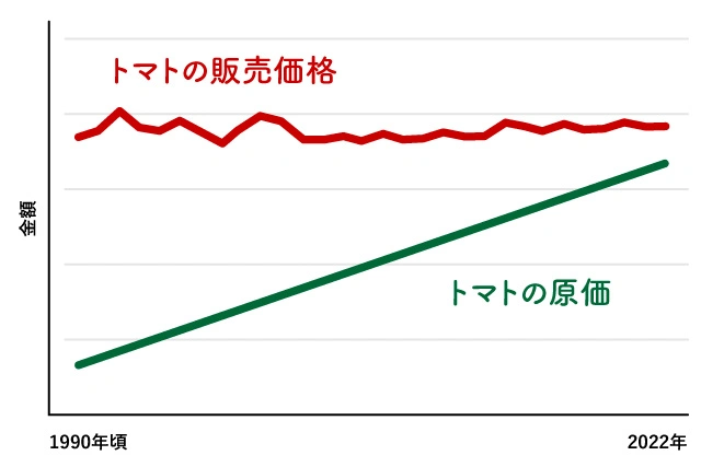 トマトの収穫量・販売価格は約30年前と比べほぼ変わっていないにもかかわらず、物価の上昇に伴いハウスの光熱費、資材費、肥料の価格、つまりトマトの原価は毎年どんどん膨れ上がっています。(グラフは総務省統計局小売物価統計調査のデータを参考にしたイメージです。)