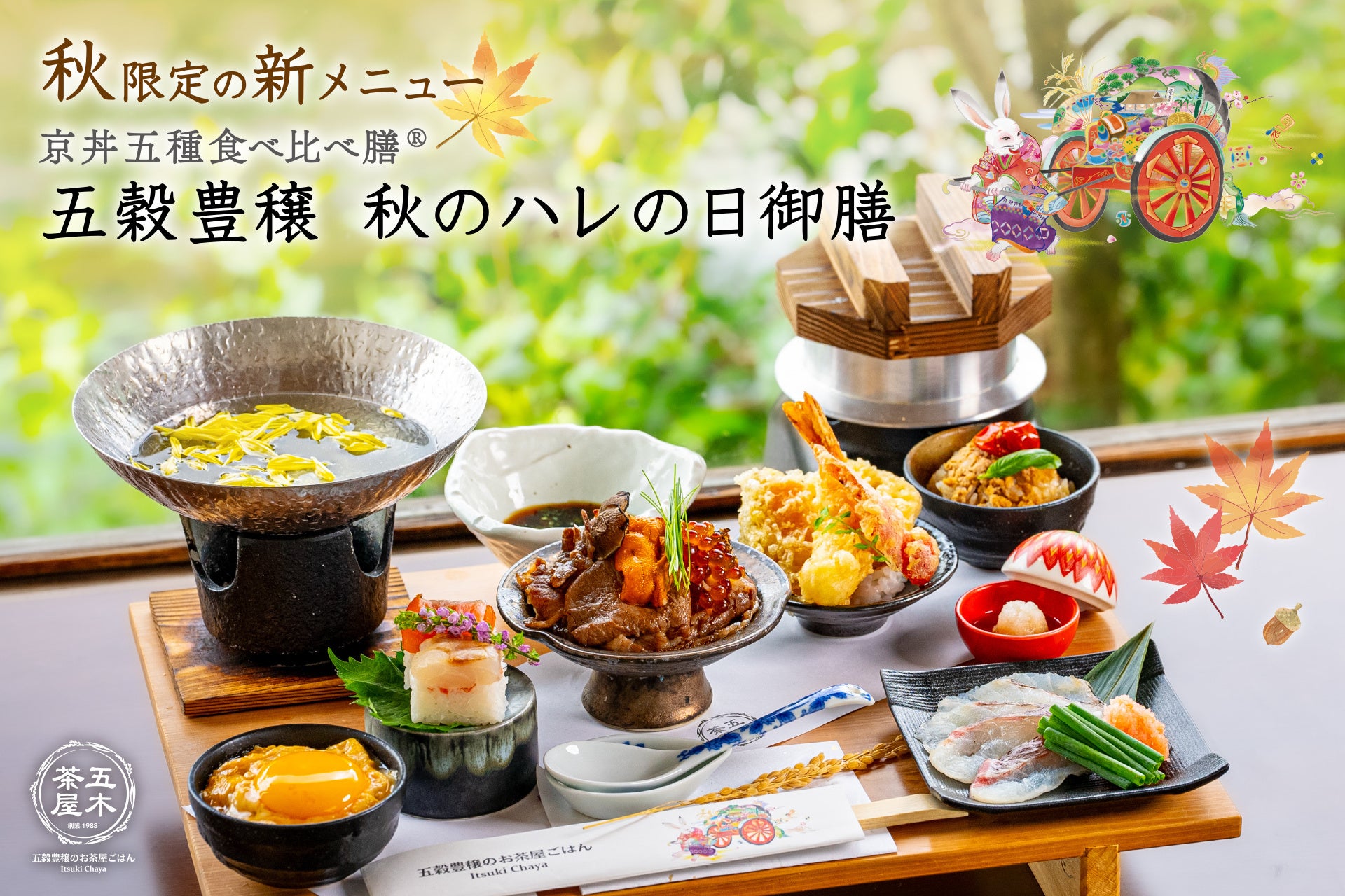 五穀豊穣のお茶屋ごはん®︎ 五木茶屋 嵐山本店では、秋の新メニュー【秋の京丼五種食べ比べ膳】を発表。旬真っ只中の秋の味覚をふんだんに使っています。見た目でも味わいでも秋を多様に楽しめる贅沢なお膳を提供しているのは、ここ五木茶屋だけ。川庭の風情をお楽しみいただける嵐山本店にて、過ごしやすくなった秋の京都旅をご満喫ください。
