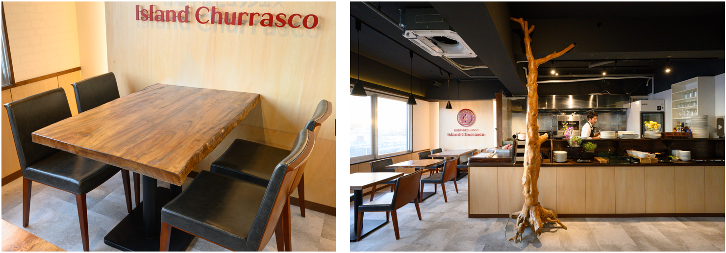 ブラジルの食文化であるシュラスコを、石垣島の食材と沖縄の伝統文化を感じる空間でご提供することで、両方の特徴や個性を引き出し、食を通じて全世界のお客様が楽しんでいただけるような新たな価値の提供を世界に発信してまいります。 (左画像:特注の琉球松テーブル、右画像:店舗中央のチャーギ)