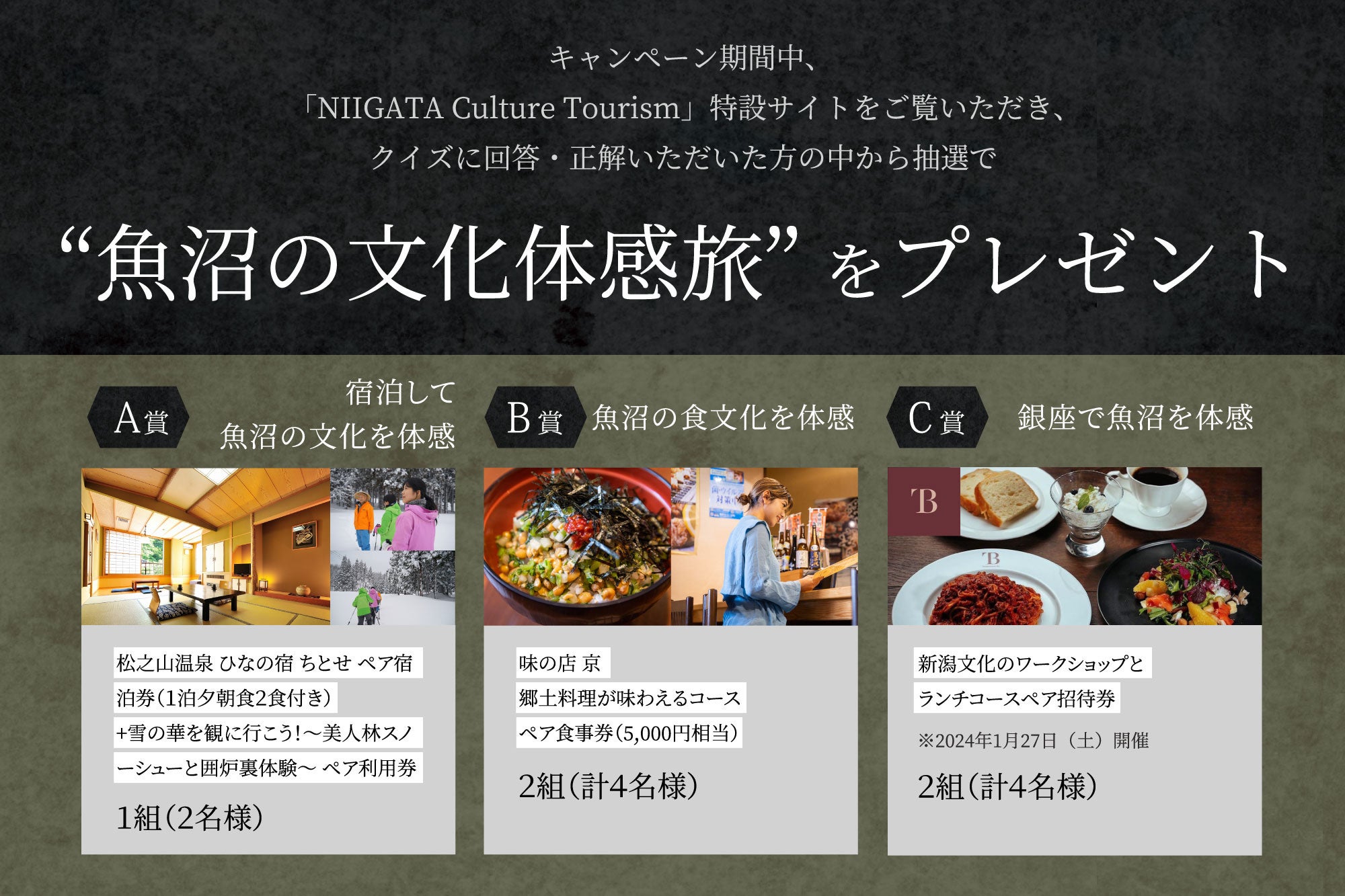 新潟県魚沼エリアの雪国の魅力を体感できる松之山温泉宿泊&スノーシュー体験や、郷土料理が味わえる食事券、銀座で行われる文化体験ワークショップへの招待券を応募者の中から抽選でプレゼントします。
