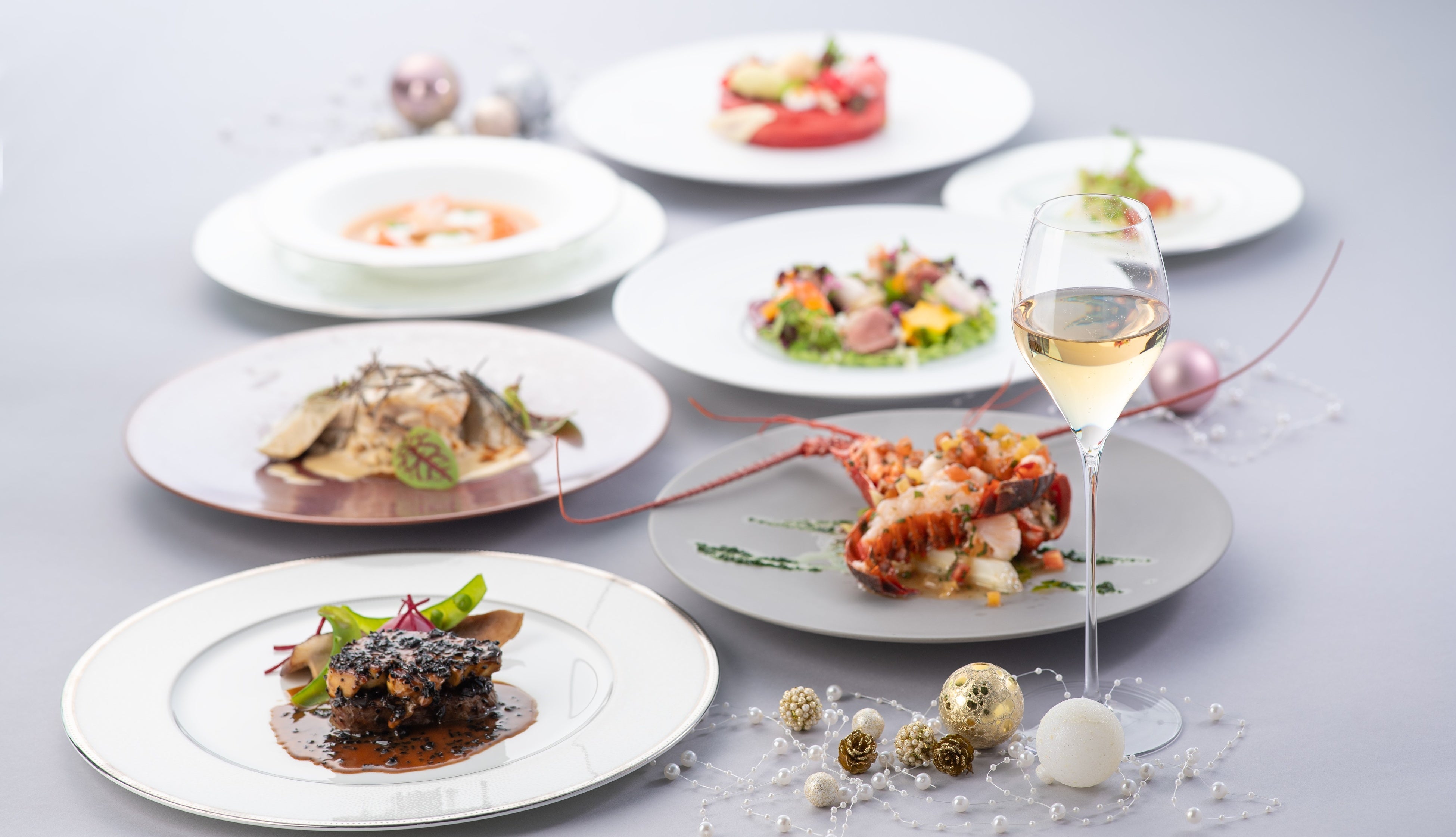 ホテル伝統の一品、鮑の肝を加え濃厚さを加えた香り豊かなブルギニヨン。ツリーに見立てたオードヴルは車海老、鮑、真珠貝柱など、海の幸で彩りました。伊勢海老のグラチネはソースの味わい、伊勢海老の甘みと食感を堪能する一皿。伊勢海老クリームスープ、松阪牛のロッシーニなどクリスマス気分が高まる贅沢な品々をお楽しみいただけます。