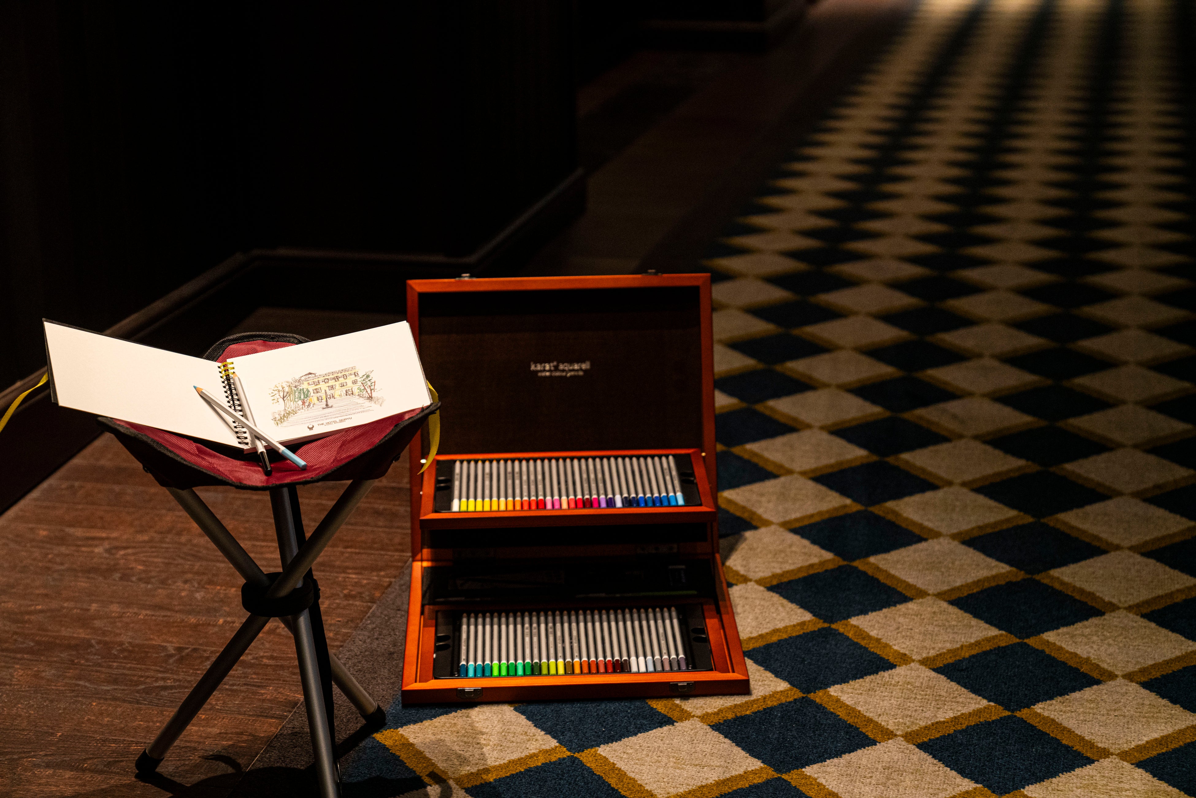 客室から飛び出し、貸出の持ち運び椅子を携え、廊下や中庭、テラスなどお好きな場所でスケッチをお楽しみいただけます。絵を描くのが苦手な方も、お好きな方も楽しめる大人のお絵描きプランです。