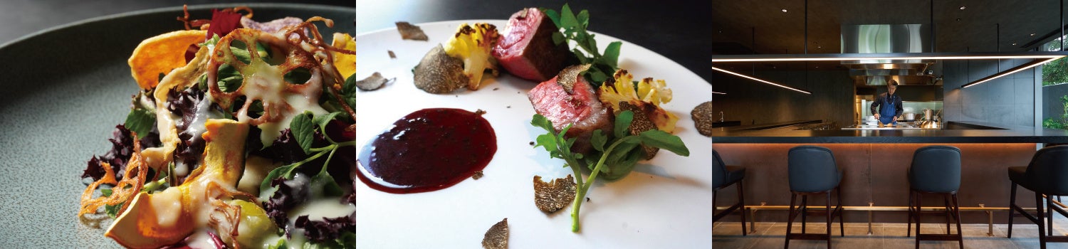 10月からの新メニューは、70種類以上の多種多様な食材がひとつの料理の中でハーモニーとなり、コースの中で走り・旬・名残の食材が季節の流れを演出する。世界三大珍味のキャビア、トリュフ、フォアグラにオマールエビなどが加わった華やかなコースで、秋を代表する食材のキノコ、銀杏、栗、かぼちゃも季節の彩りを添える。先付けの「帆立と唐墨(からすみ)」、温菜の「フォアグラと秋野菜」や、肉料理の「下村牛とトリュフ」など、食材の個性を引き出したそれぞれの一皿がコース全体で調和し、繊細かつ壮大なパフォーマンスを届ける。ランチ・ディナーコース共通で、9皿のコースが1名13,200円、また新しく加わった6皿のコースが9,790円。ソムリエ資格を持つ「シェフとの会話も楽しい」、と人気のペアリングワインも引き続き提供(7グラス 7,700円、5グラス 5,500円)する。この「五感で楽しむディナーコース」がついた夕・朝食付き宿泊プランも好評で、小学生以下を対象にしたお子様向けメニューで家族旅行も応援する。