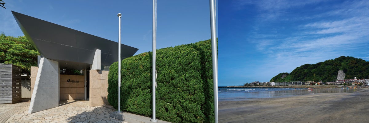 (左)プライベート感のあるWeBase鎌倉のエントランス。(右)由比ヶ浜ビーチまで徒歩1分。