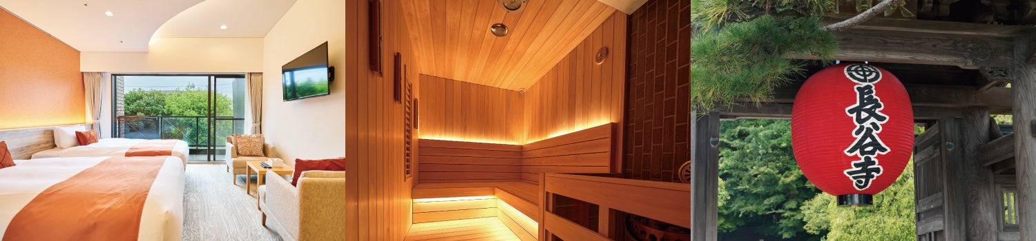 (左)スーペリアツインルーム(中央)セルフロウリュを備えたサウナ(右)WeBase鎌倉は長谷寺から徒歩15分またはタクシー5分の便利な場所に位置し、周辺には鎌倉の主要な観光スポットが点在。
