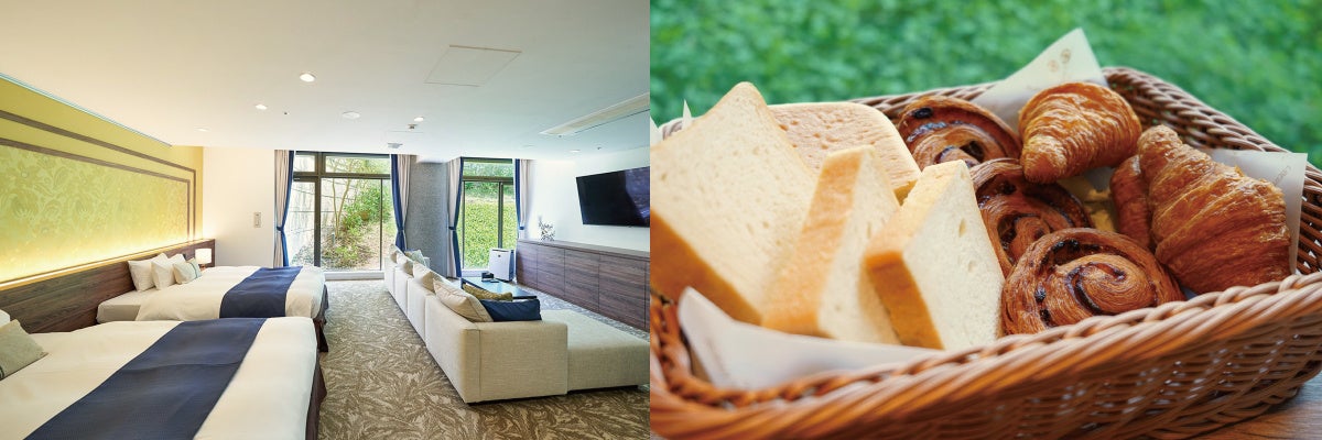 (左)客室は全8タイプ。天井が高く開放的で快適な客室(プレミアムアツイン)(右)人気のリベルテ・パティスリー・ブーランジェリーのクロワッサンほか