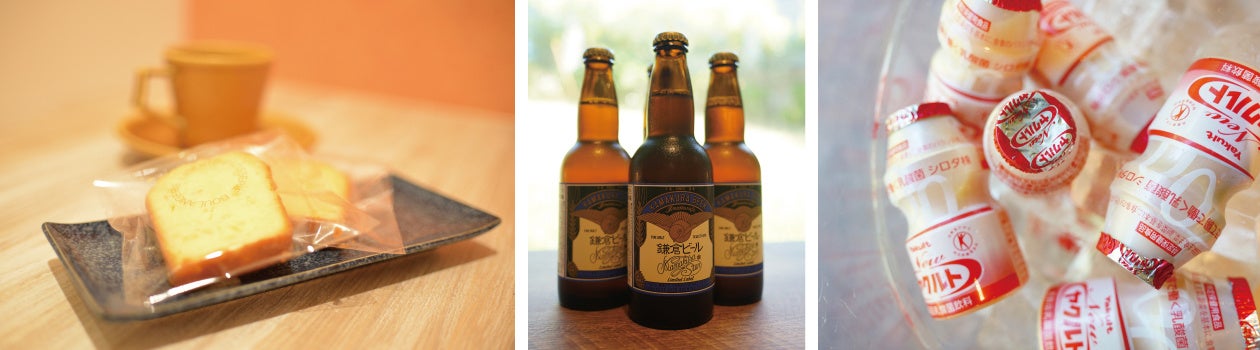 (左)ウェルカムスイーツ(「リベルテ・パティスリー・ブーランジェリー」のケークシトロン)(中央)鎌倉ビール星(980円)の販売(右)お風呂上りに嬉しいヤクルトの提供も。(なくなり次第終了。)