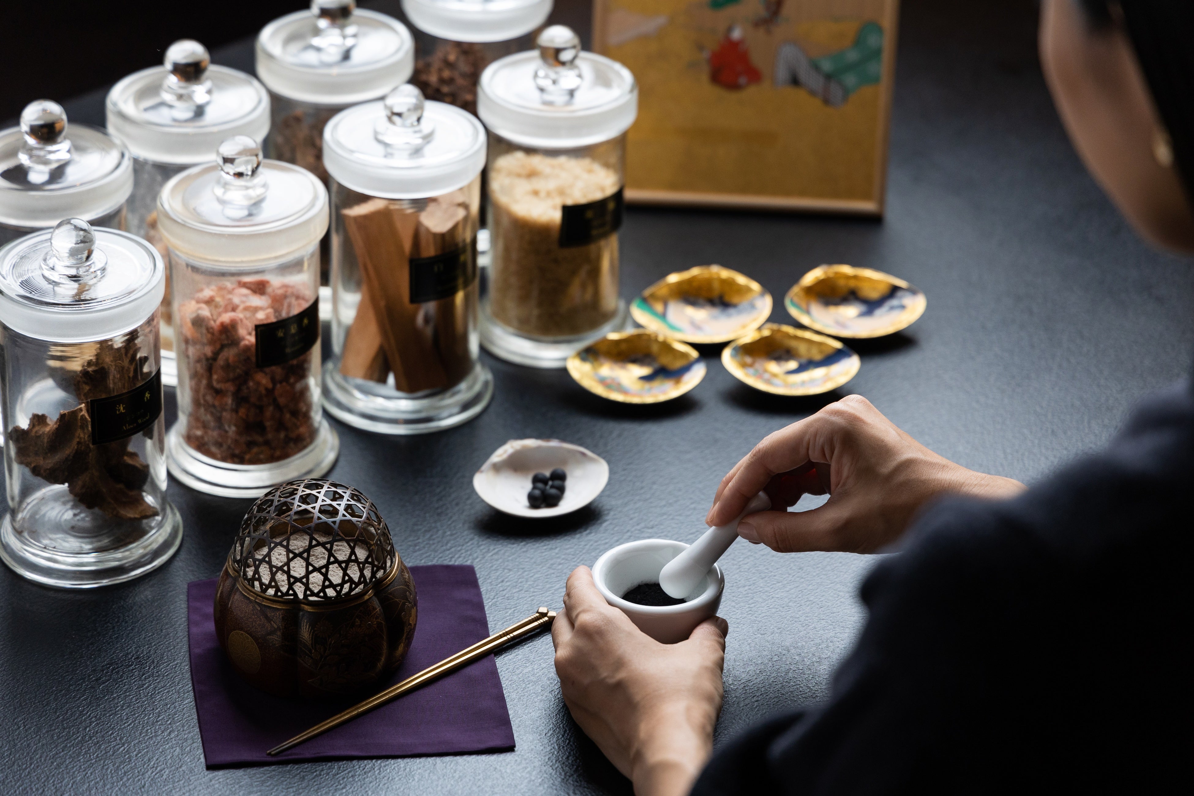 平安貴族は冬のゆったり過ごす時期に、薫物合わせで香りに興じていました。平安貴族の文化にならい、冬の香りを楽しめる香原料を自分好みに調合します。香原料は、京都の老舗香木店の山田松香木店があつらえた本格的なもので、粉末にした香木や天然香原料を調合し、蜜や梅肉で練り合わせてつくります*6。喧騒から離れた星のや京都で、香りづくりに集中することで、せわしない日常を忘れることができる時間です。
