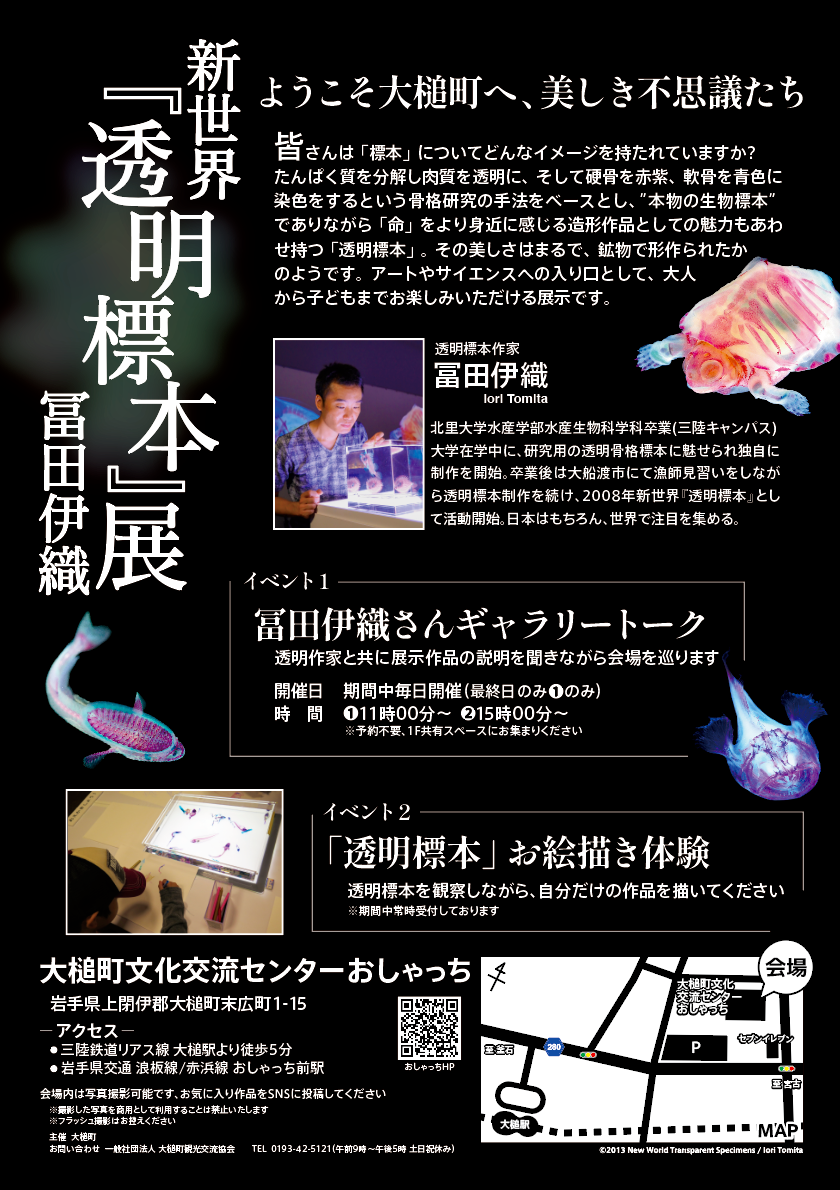 そんな美しくも不思議な「透明標本」の特別展を、岩手県大槌町にて開催いたします。アートやサイエンスへの興味を深める入り口として、大人から子どもまで多くの皆さんのご来場をお待ちしています。