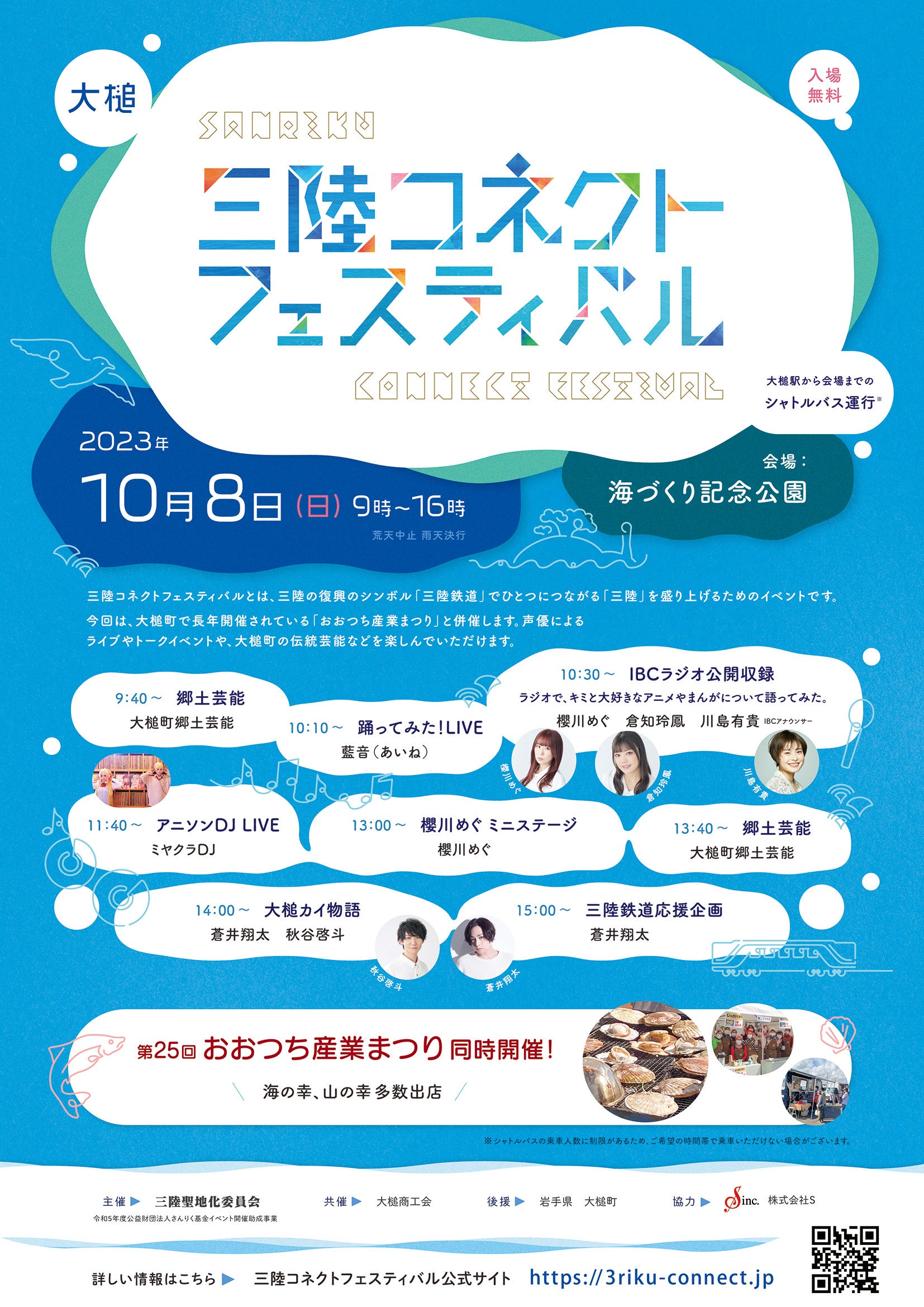 産業まつりでは、餅まきや美味しいグルメ出店などを、三陸コネクトフェスティバルでは、大槌カイ物語声優の「蒼井翔太」さん達によるトークイベントなどをお楽しみいただけます!