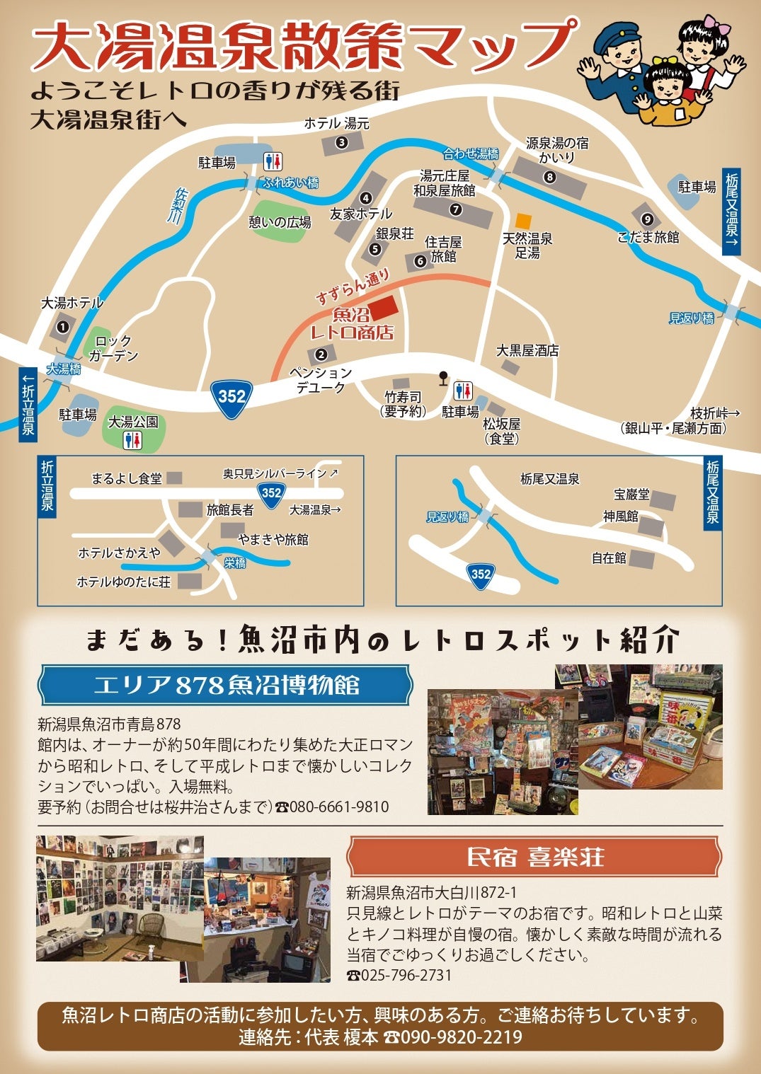 うおぬまレトロ化計画は、コレクションが『触れる、聞ける、読める、遊べる!』こ とができる、 全国的にも稀有な「体験型レトロ店」を展開しています。店内には懐かしい映画ポスターや雑 誌、レコード、玩具等が置かれ、誰でも触れて楽しむことができます。また、店内では駄菓子 や玩具の物販、珈琲などの飲食提供も行われます。レトロなコレクションを有効活用し、大湯 温泉の賑わい再生による、尾瀬観光活性化の足掛かりにつなげてまいりたいと考えております。