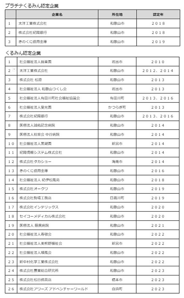 • 和歌山県内認定企業名一覧(2023年8月21日現在)