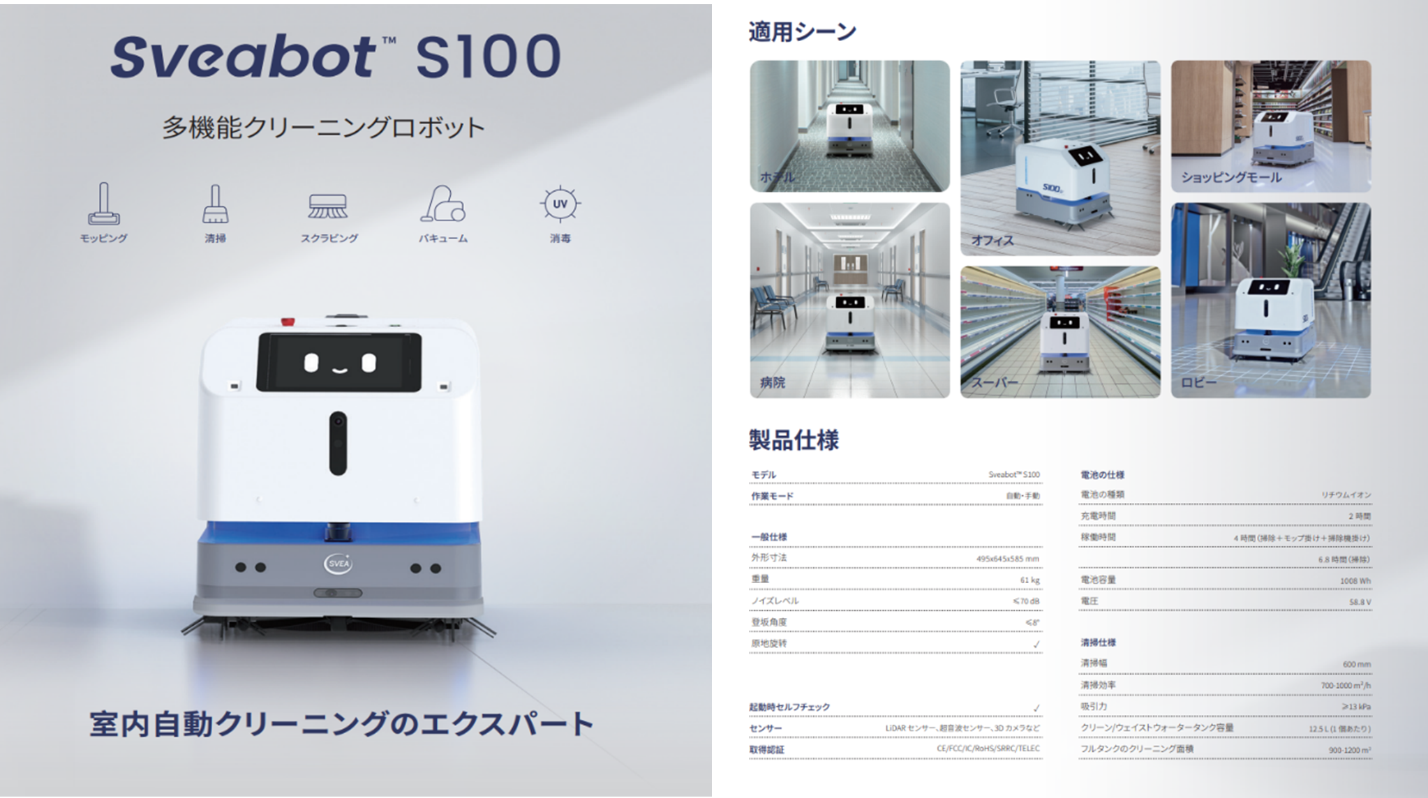 当社は、「サービスショット」のラインナップとして、新たに、コンパクトサイズ(高さ:58.5cm 幅:64.5cm 奥行:49.5cm)ながら、「拭き掃除」「こすり洗い」「掃き掃除」「吸い込み」「消毒」などあらゆる掃除を1台で行うお掃除ロボットが加わり、この度、販売を開始いたしました。
