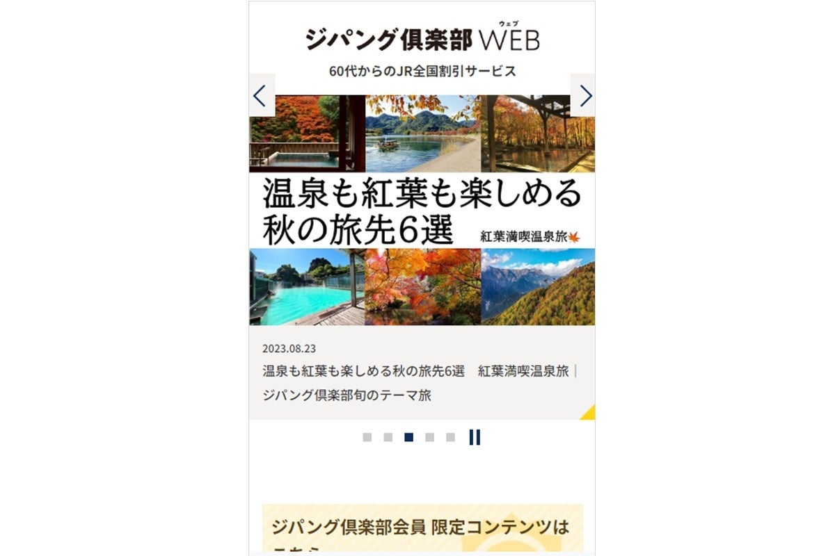 全国のJR線が割引になるシニア向けのサービス「ジパング倶楽部」の公式ホームページです。全国のJR線を使った「モデルコース」や、観光関連の話題を集めた「おでかけニュース」、シニア世代の方々に役立つ情報「解決!60代からのお悩みごと」など、シニアの方々に楽しんでいただける、全国の旅をはじめとしたさまざまな情報を提供しています。