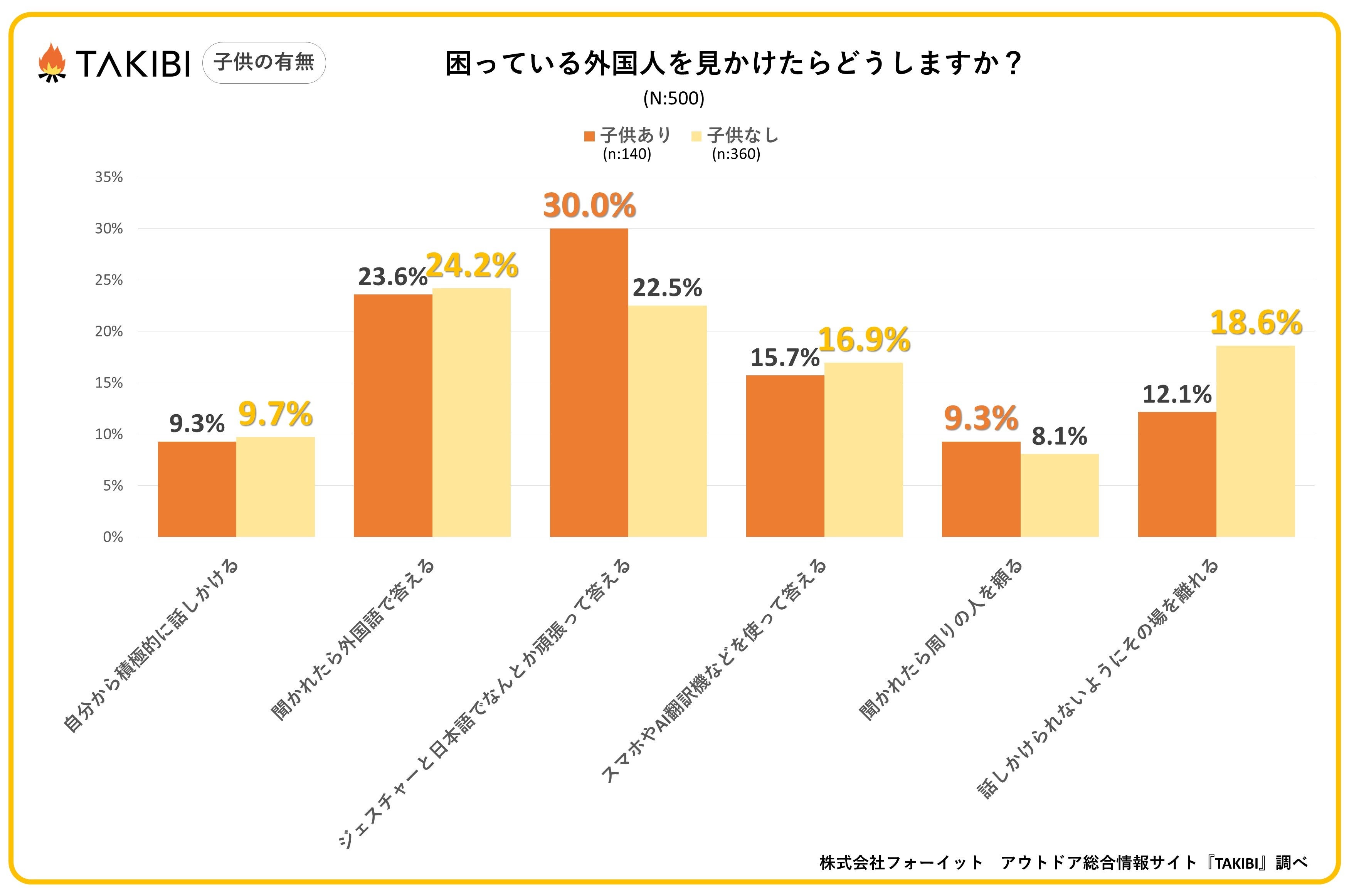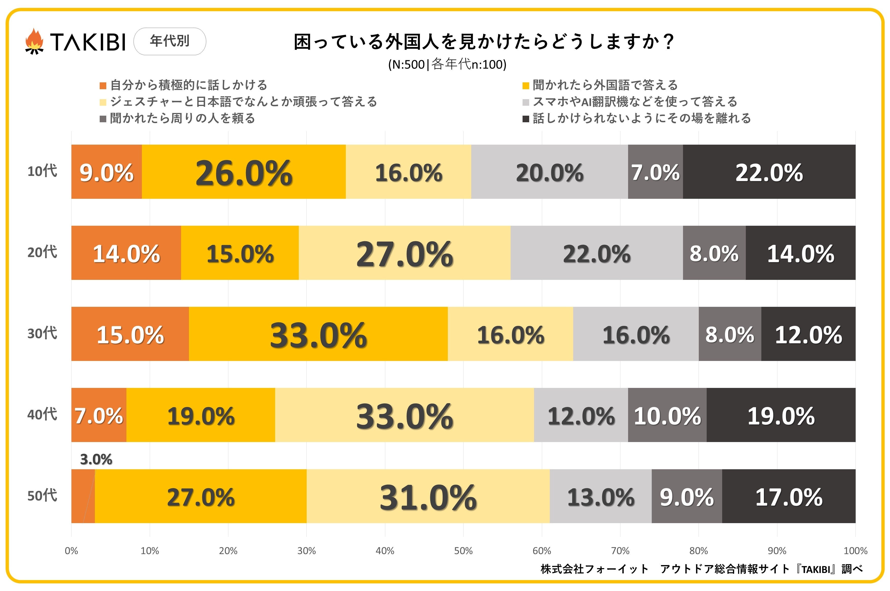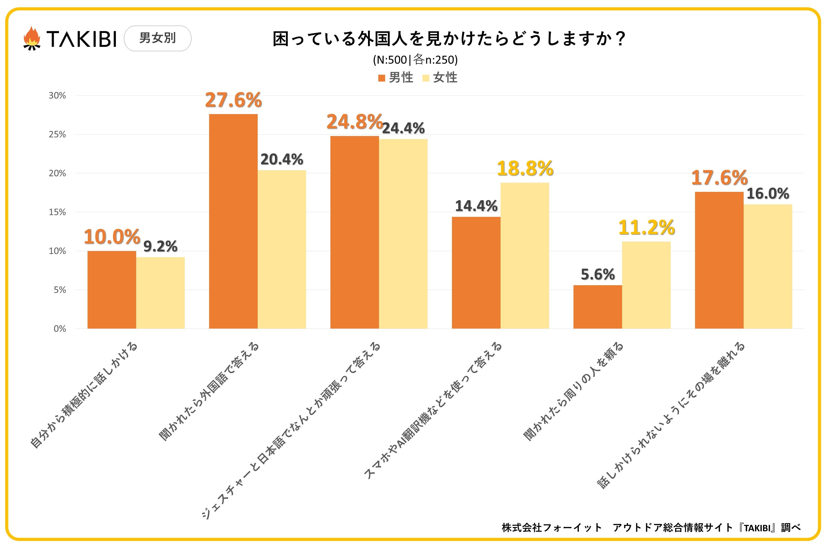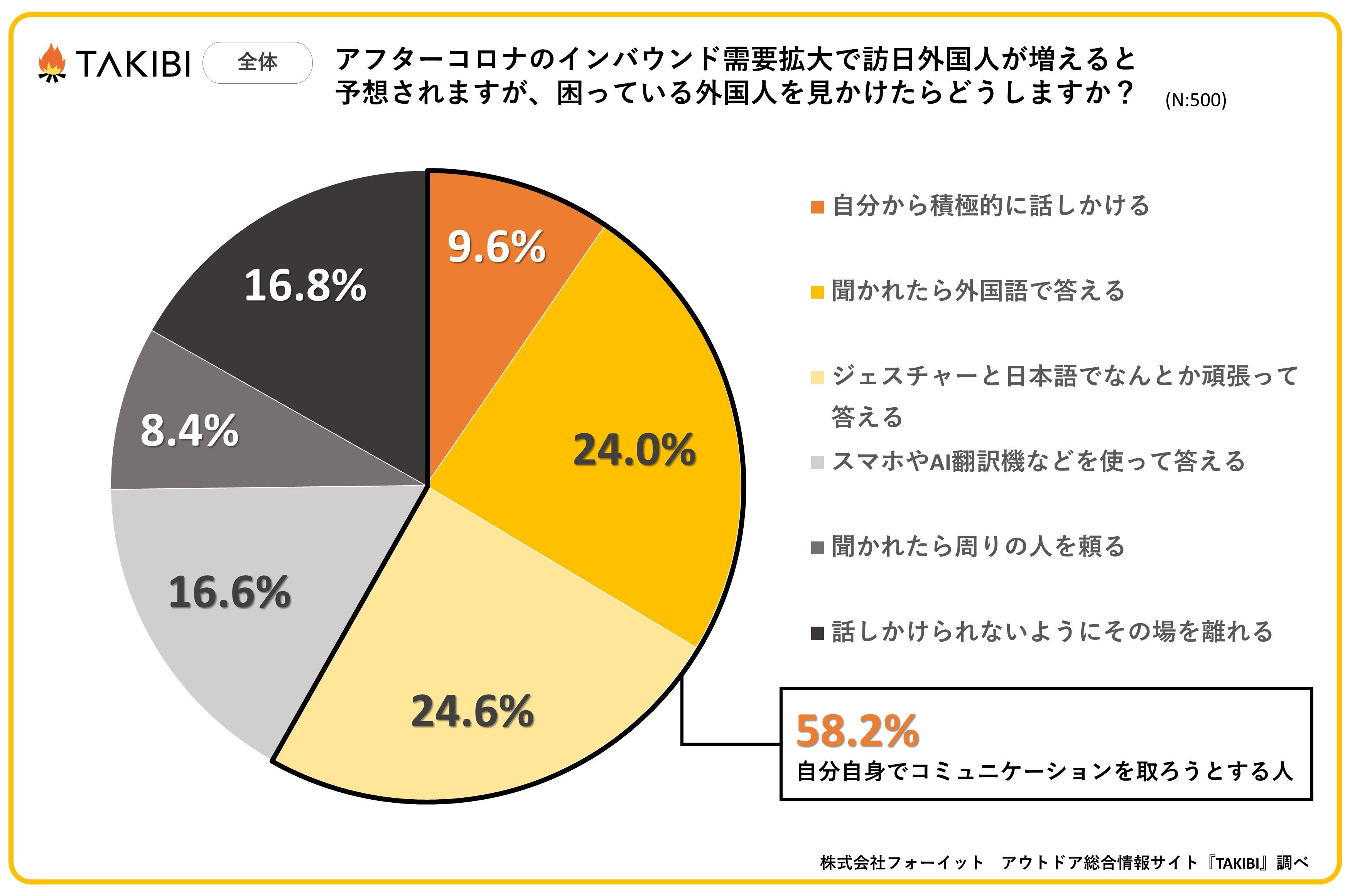 キャンプやグランピングを中心としたアウトドア総合情報サイト「TAKIBI」の運営をおこなう株式会社フォーイットは、全国の10代~50代までの男女500人を対象に外国人とのコミュニケーションに関するアンケートを実施し、男女別・年代別等の特徴についてまとめました。