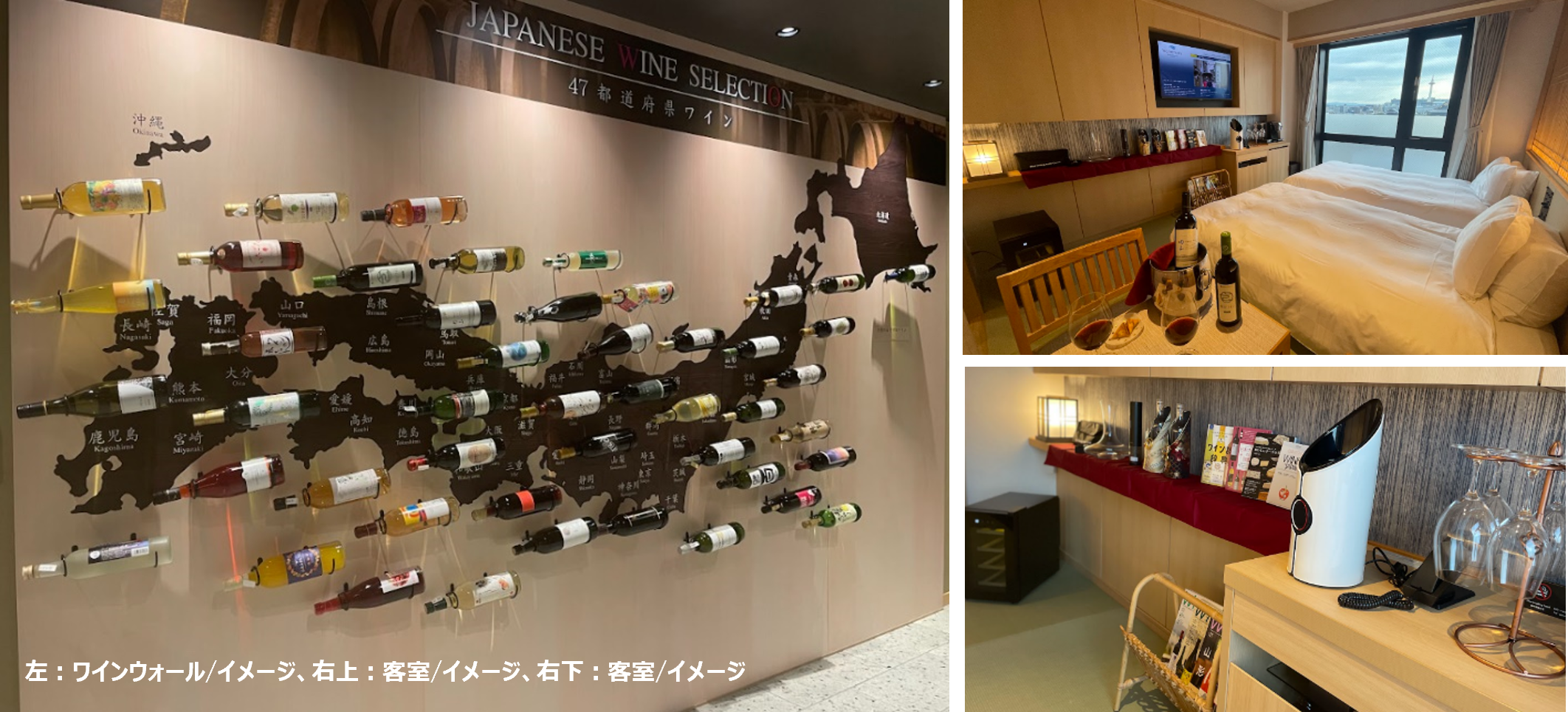 オープン3周年記念として、普段目にすることがあまりない珍しいワインも含めた、日本全国47都道府県すべてのご当地ワインをご用意いたしました。お客様にはホテル滞在を旅の思い出や旅の目的の一つにしていただき、また、インバウンドのお客様には日本の文化にふれていただきたいと考えております。ホテルロビーに設置した大きな日本地図ボードに各地のワインを飾り、お客様にはお好きなワインを1本お選びいただき、客室にてお楽しみいただきます。客室には着物風のワインスリーブ、デキャンタ、ワインに関する書籍をご用意しており、また、京都のランドマークでもある「京都タワー」がのぞめます。ワインルームの価格は素泊まり14,500円~、朝食付16,480円~(いずれも1泊1部屋あたり、税サ込)