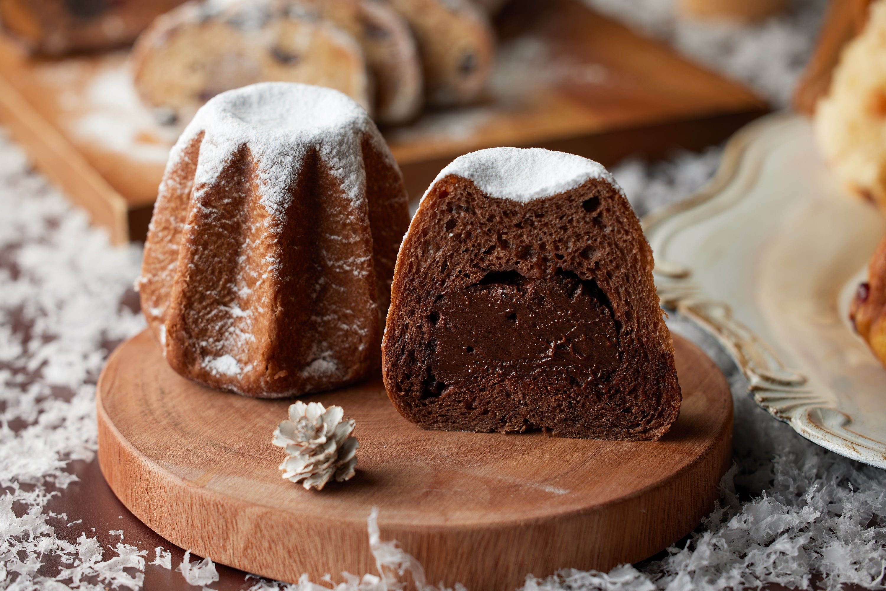 ココアを混ぜ込んだブリオッシュの生地でチョコレートカスタードをたっぷりと包み、仕上げに雪のような粉糖をふりかけました。