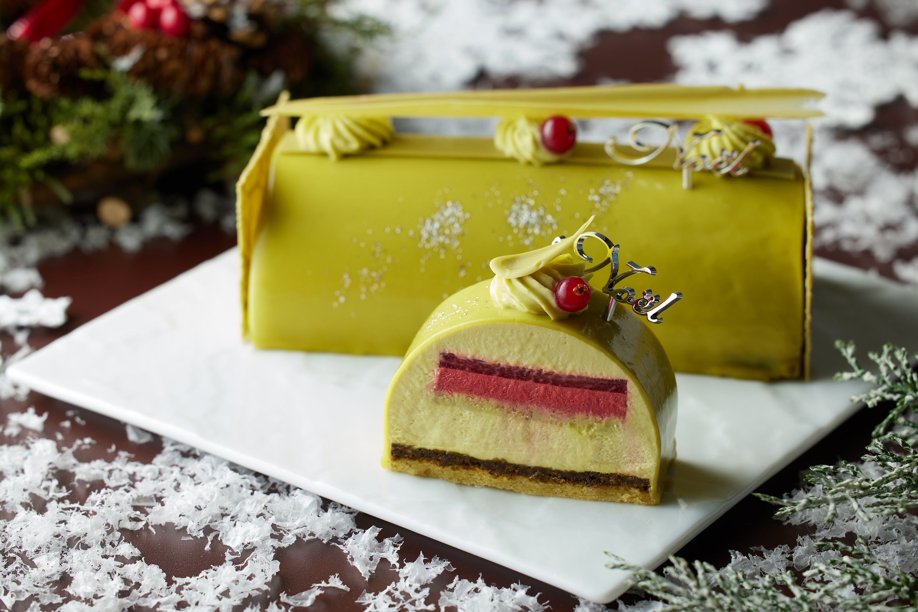 濃厚なピスタチオに酸味のあるさくらんぼ、フランボワーズを合わせた、2色のクリスマスカラーのコントラストが美しいブッシュ・ド・ノエルです。ローズマリーの香りを加え、濃厚ながらも爽やかさを感じる一品に仕上げました。