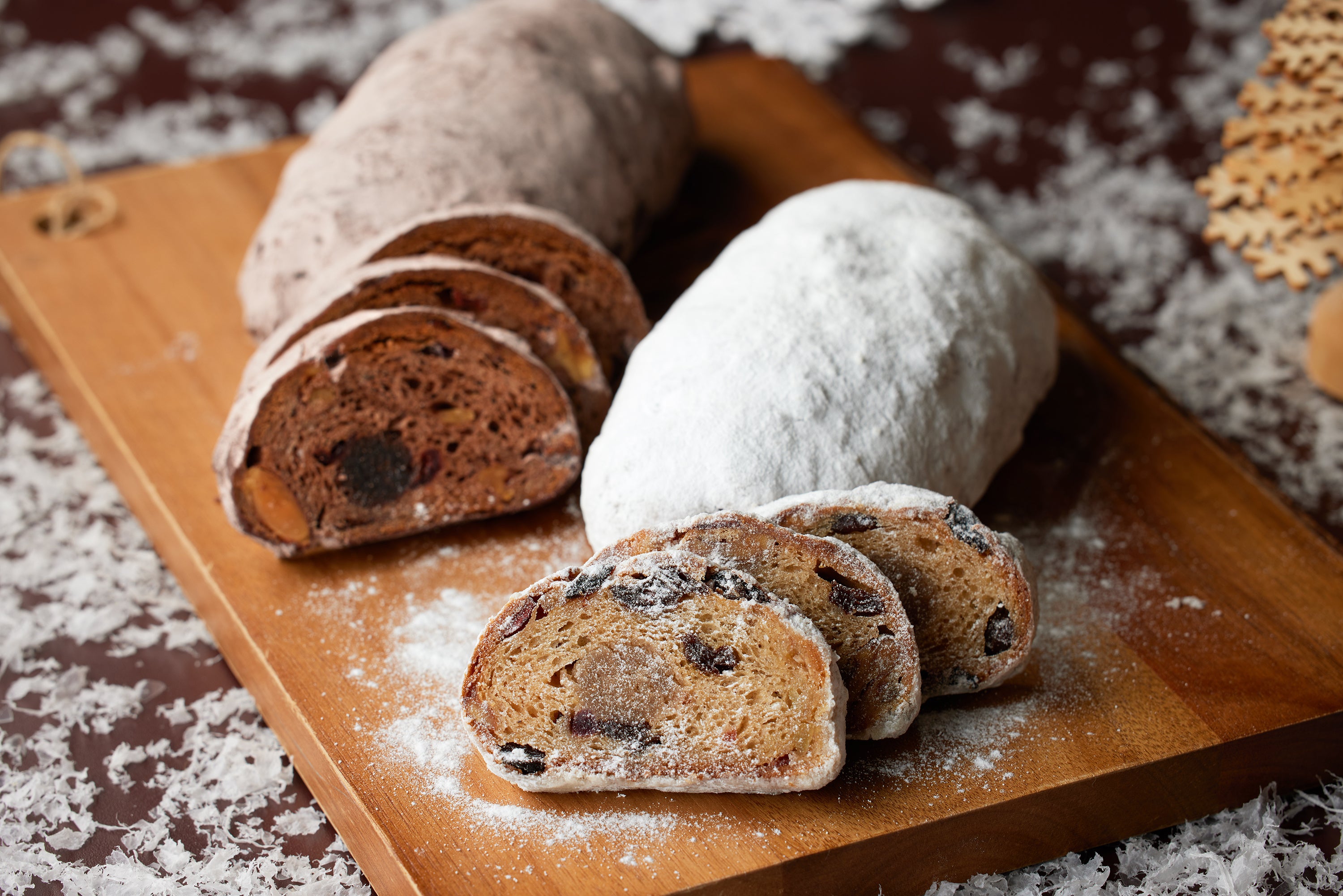 バターをたっぷり加えた生地にドライフルーツやナッツ類、アクセントにシナモンとナツメグを加えた毎年人気のシュトーレンです。チョコシュトーレンはココアやチョコレートも練り込んだ生地で、ココアのマジパンを包みました。