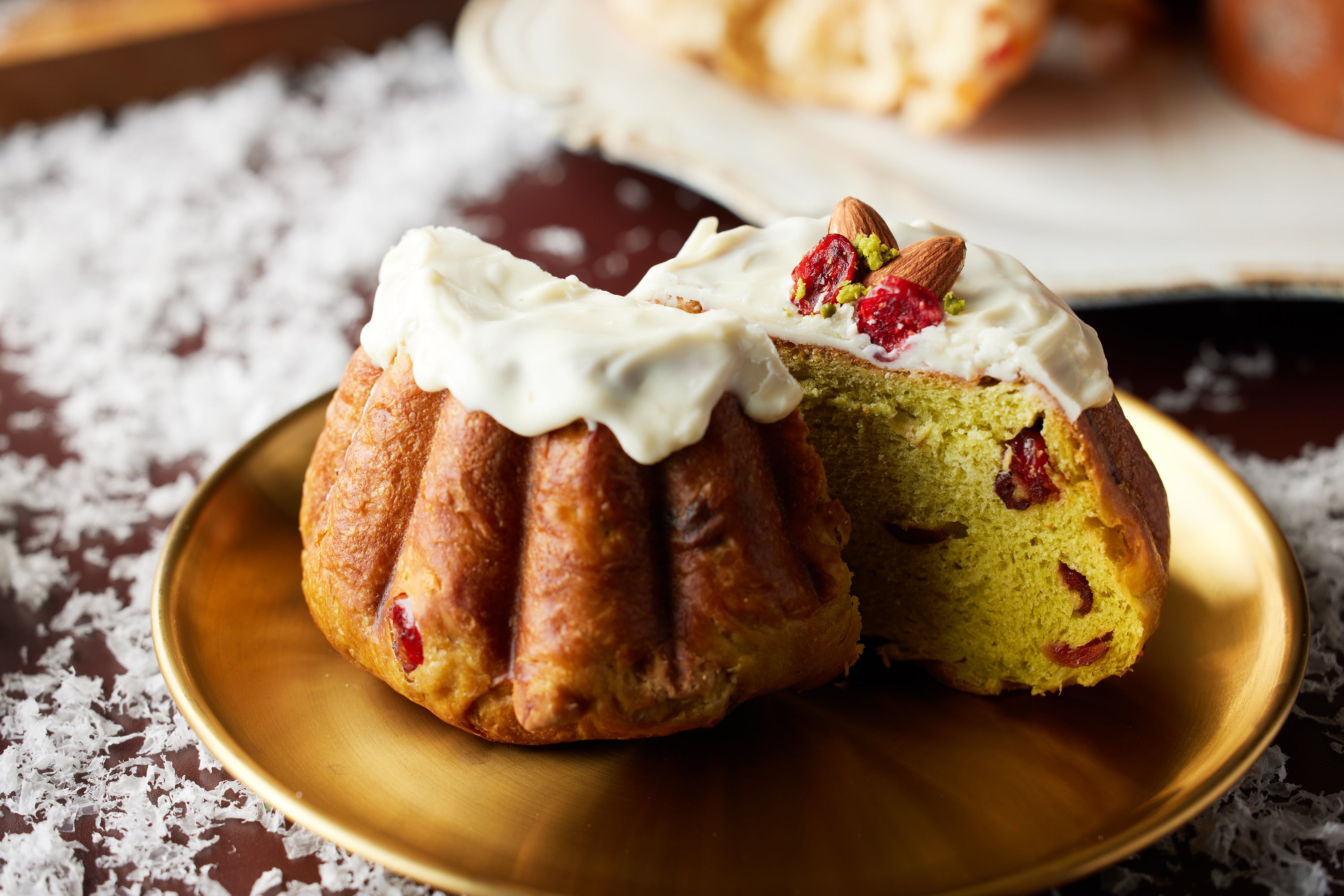 限定ブレッドには、毎年ご好評をいただいている2種の「シュトーレン」や、伝統的なクリスマスブレッドである「パン・ドリーノ」や「パネトーネ」のほか、まるで雪が積もったクリスマスツリーのような「クグロフ ピスタチオ」が登場します。
