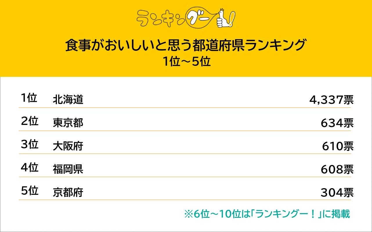 北海道が4,337票を獲得し、2位の東京都に対して約7倍もの票差をつけて1位に。47都道府県の中で、投票者からの「北海道の食事」への期待値は圧倒的に高いことがうかがえました。2位~4位の東京都、大阪府、福岡県はそれぞれ600票台、京都府はそこから約300票の差をあけて5位。以降の6位~47位までは100票以上の差が生じることはなく順位が決定しました。