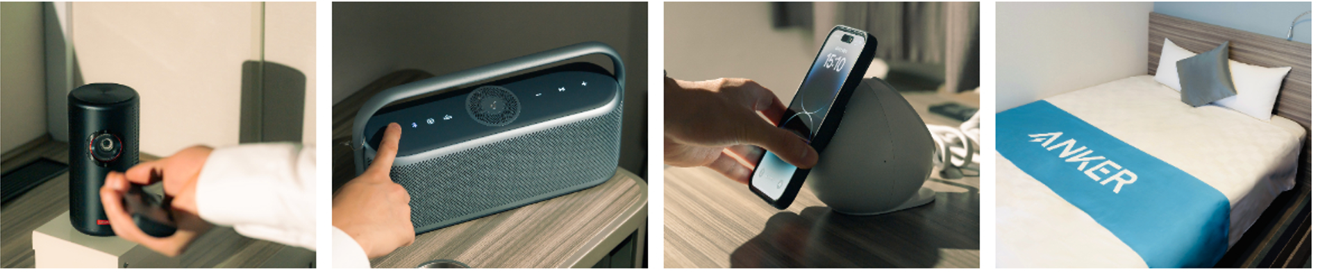 今回設置するのはモバイルプロジェクター「Nebula Capsule 3 Laser」とBluetoothスピーカー「Soundcore Motion X600」、マグネット式ワイヤレス充電ステーション「Anker 637 Magnetic Charging Station(MagGo)」の3製品。一段上の快適な宿泊環境を整えるために、宿泊中のスマートフォンやノートPCの充電だけでなく、客室内で音楽や映画等のエンターテインメントを楽しむ際にもお使いいただける製品をセレクトしました。また全ての「Anker Room」のベッドスローはAnkerロゴ入りの特別仕様でご用意する他、客室内で体験できる製品をお得にお買い求めいただけるQRコードも設置致します。