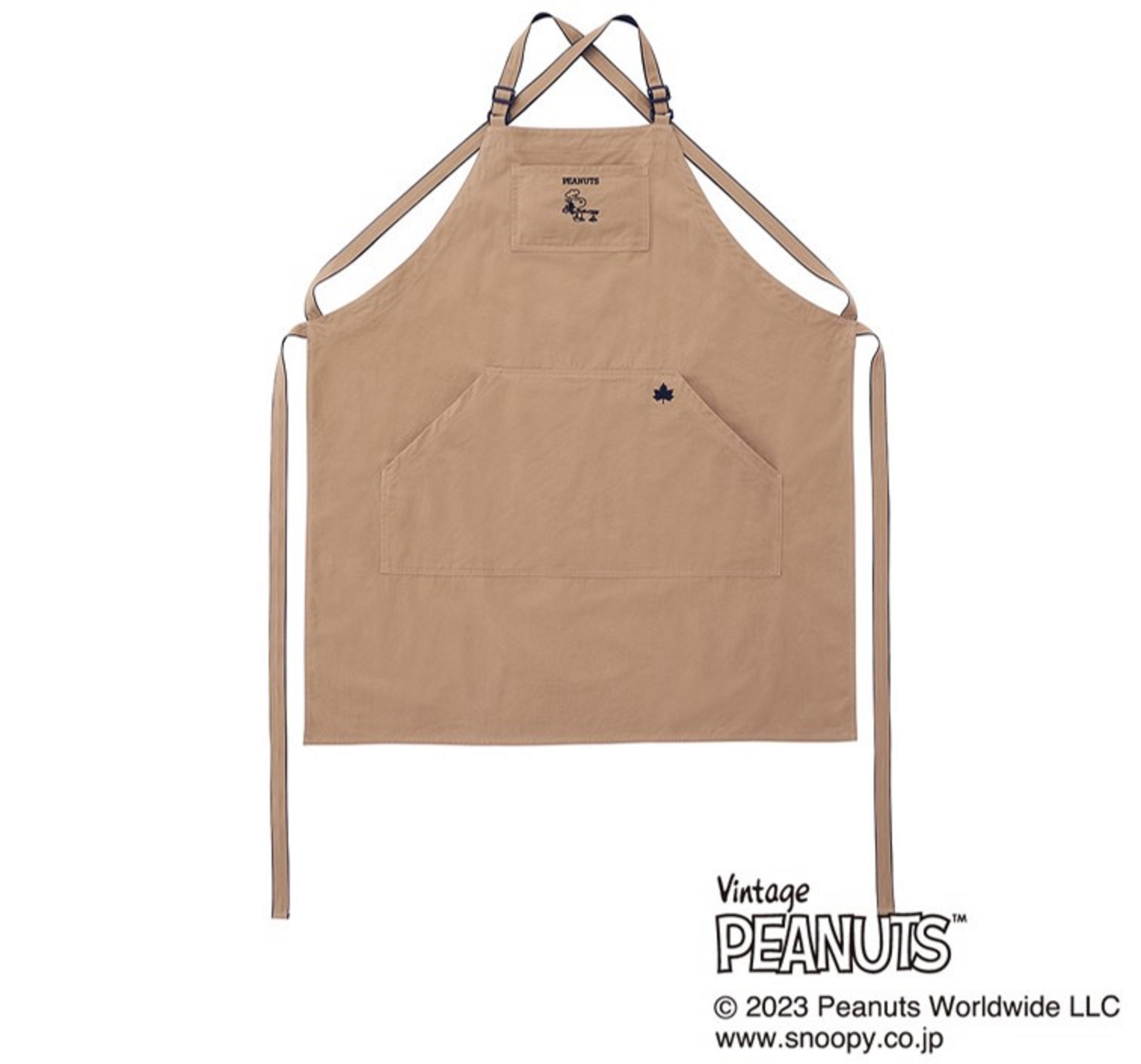スヌーピーがたき火で調理している様子のオリジナルデザインのエプロン。大容量のポケット付きで、肩紐の長さ調節も可能。