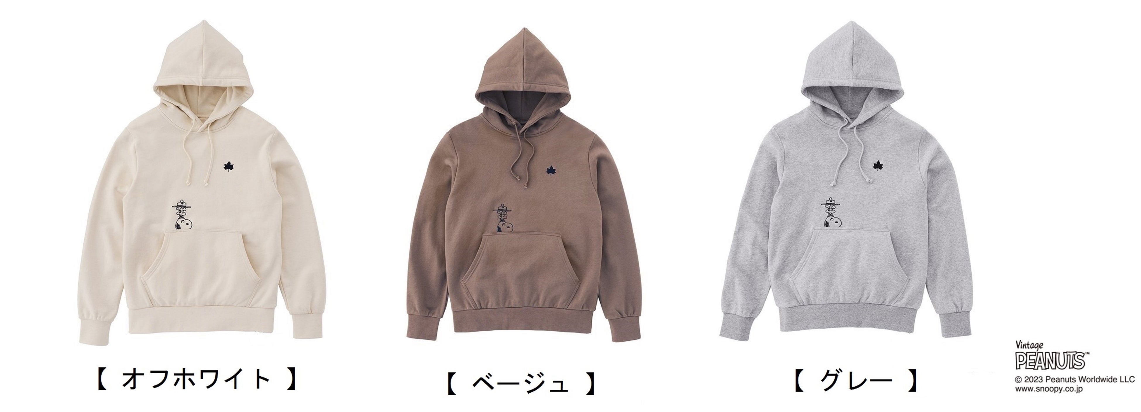 ポケットからスヌーピーとウッドストックがひょっこりしているパーカー。オフホワイト・ベージュ・グレーの3色×各M・Lの2サイズ展開。