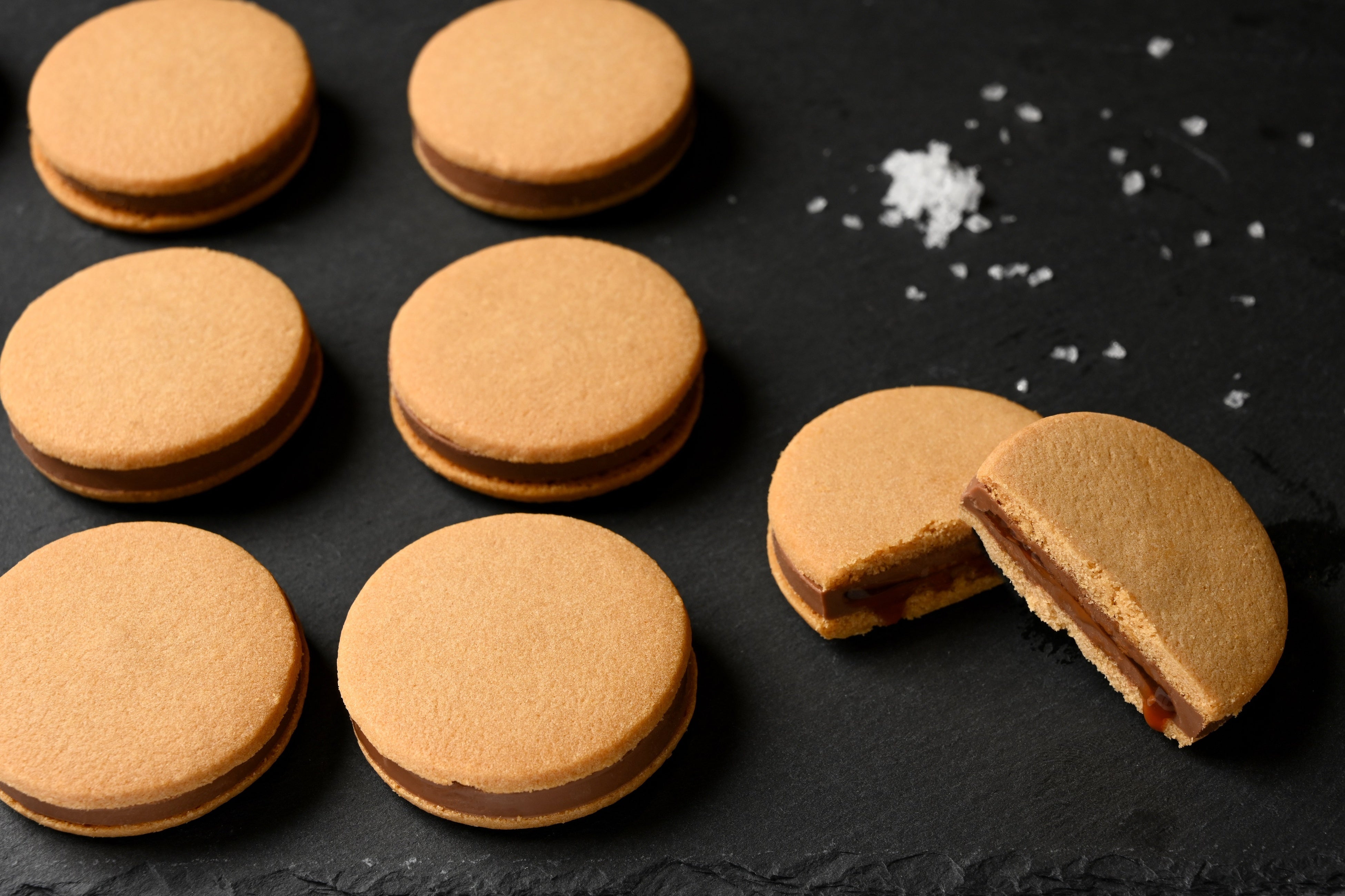サブレに練りこんだ塩は日本海・輪島で取水した海水を原料に、低温でゆっくり蒸発・濃縮させて結晶化させた「わじまの海塩」。素材の旨味を引き出す塩のおかげで、しっかりした塩味がありながらもまろやかな口当たりのサブレになりました。贅沢な厚みのミルクチョコはやわらかく、中にとじこめたとろとろのキャラメルソースとの相性は抜群で濃厚なキャラメルショコラを感じさせます。