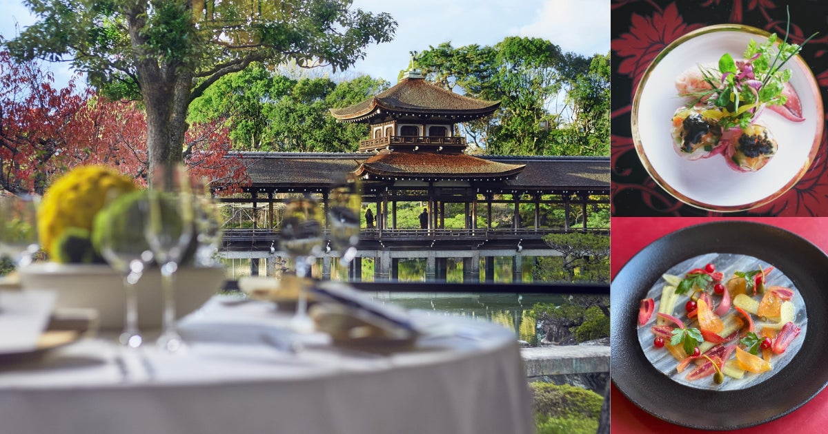 1895年(明治28年)に建立された京都随一の神宮平安神宮は、多くの重要文化財や登録有形文化財を保有し、境内にある平安神宮神苑は国指定名勝。その神苑を借景に、平安神宮御鎮座70年並孝明天皇100年祭を記念して施工されたのが平安神宮会館で、平安神宮の境内にあり、木々に包まれた静かで落ち着いた非日常な空間です。今回のイベントでは、平安神宮会館から国指定名勝神苑を眺めながら、美食をお楽しみいただけます。