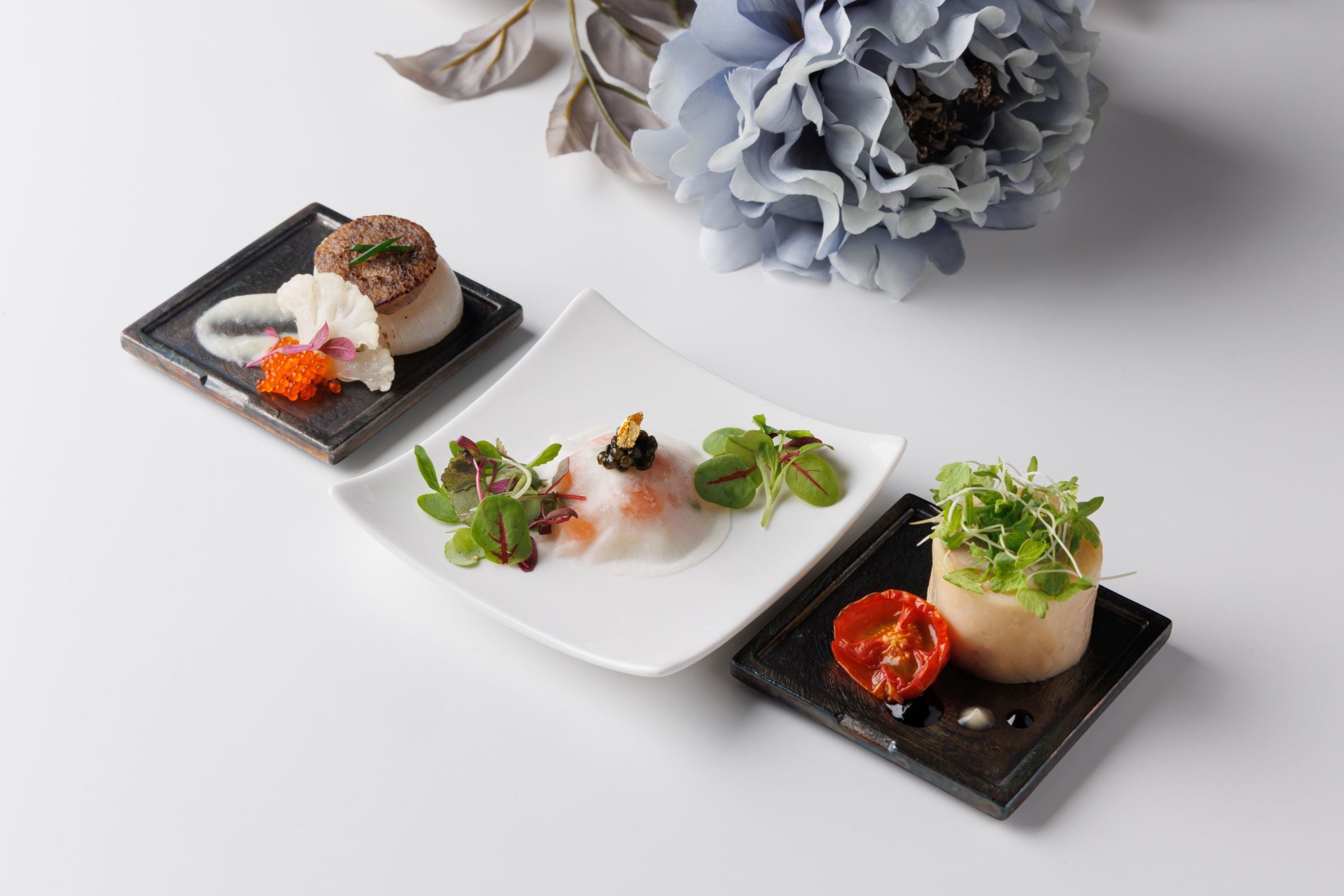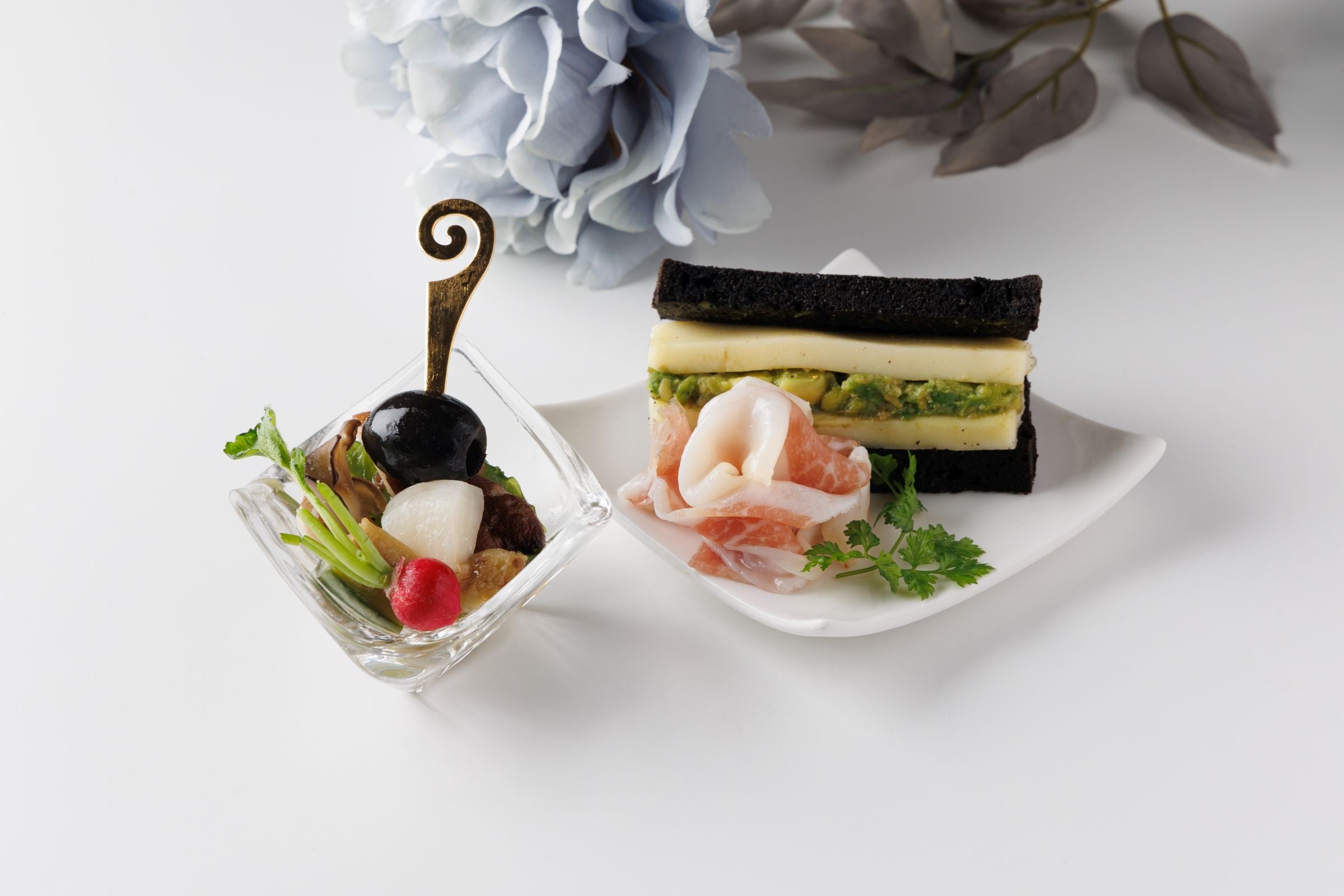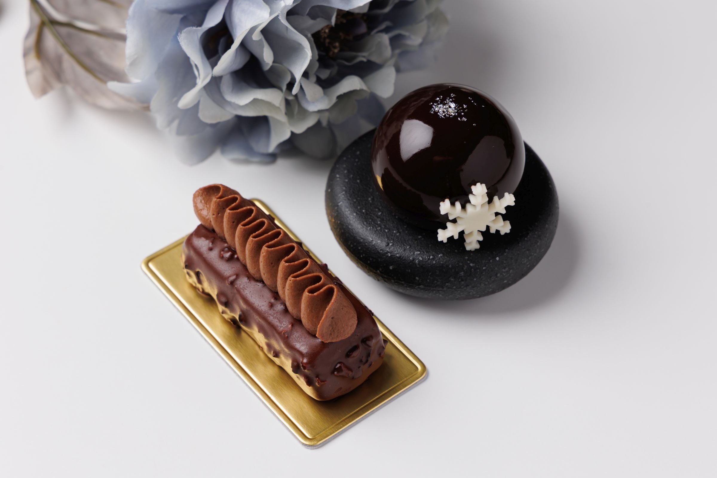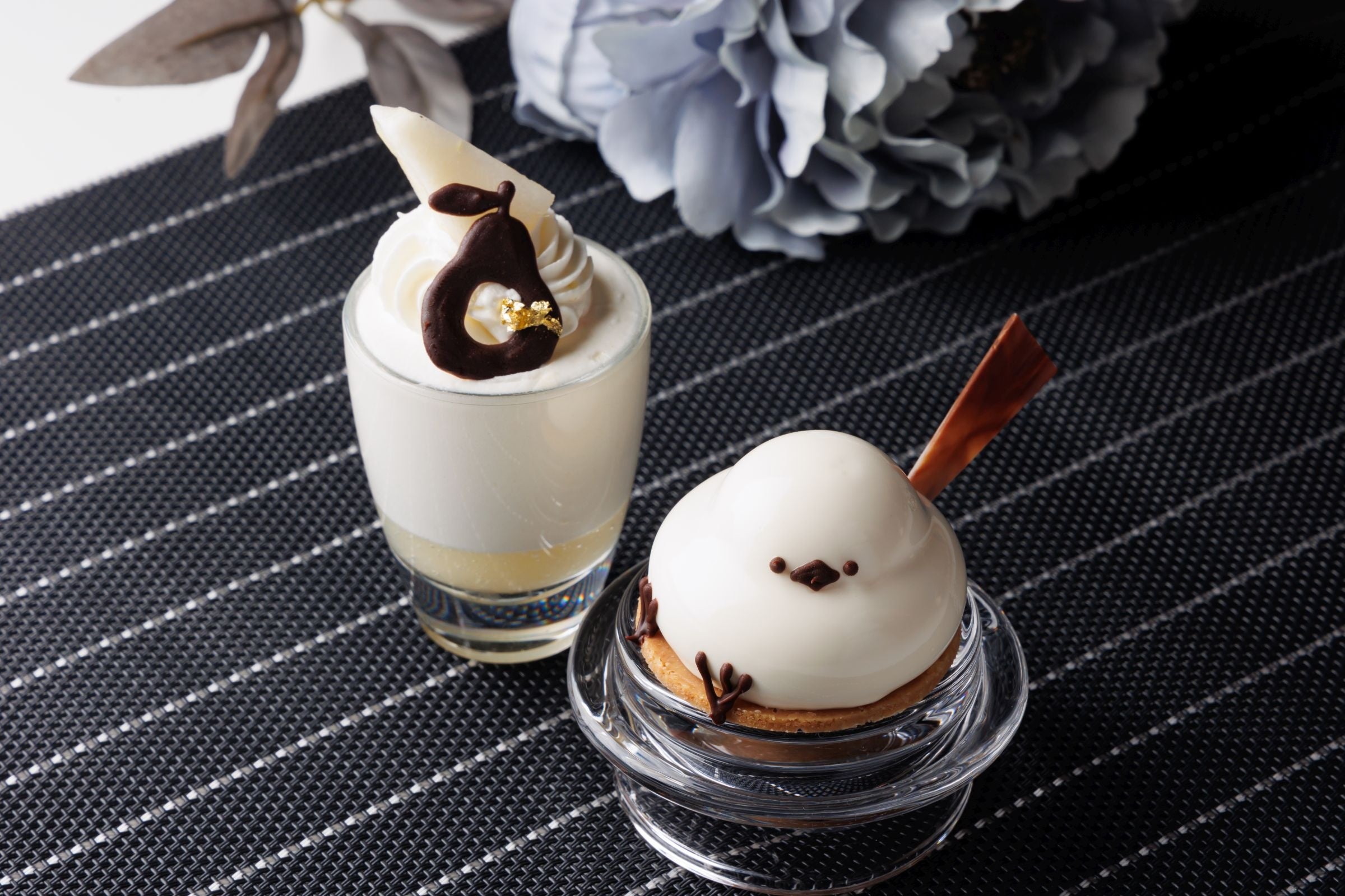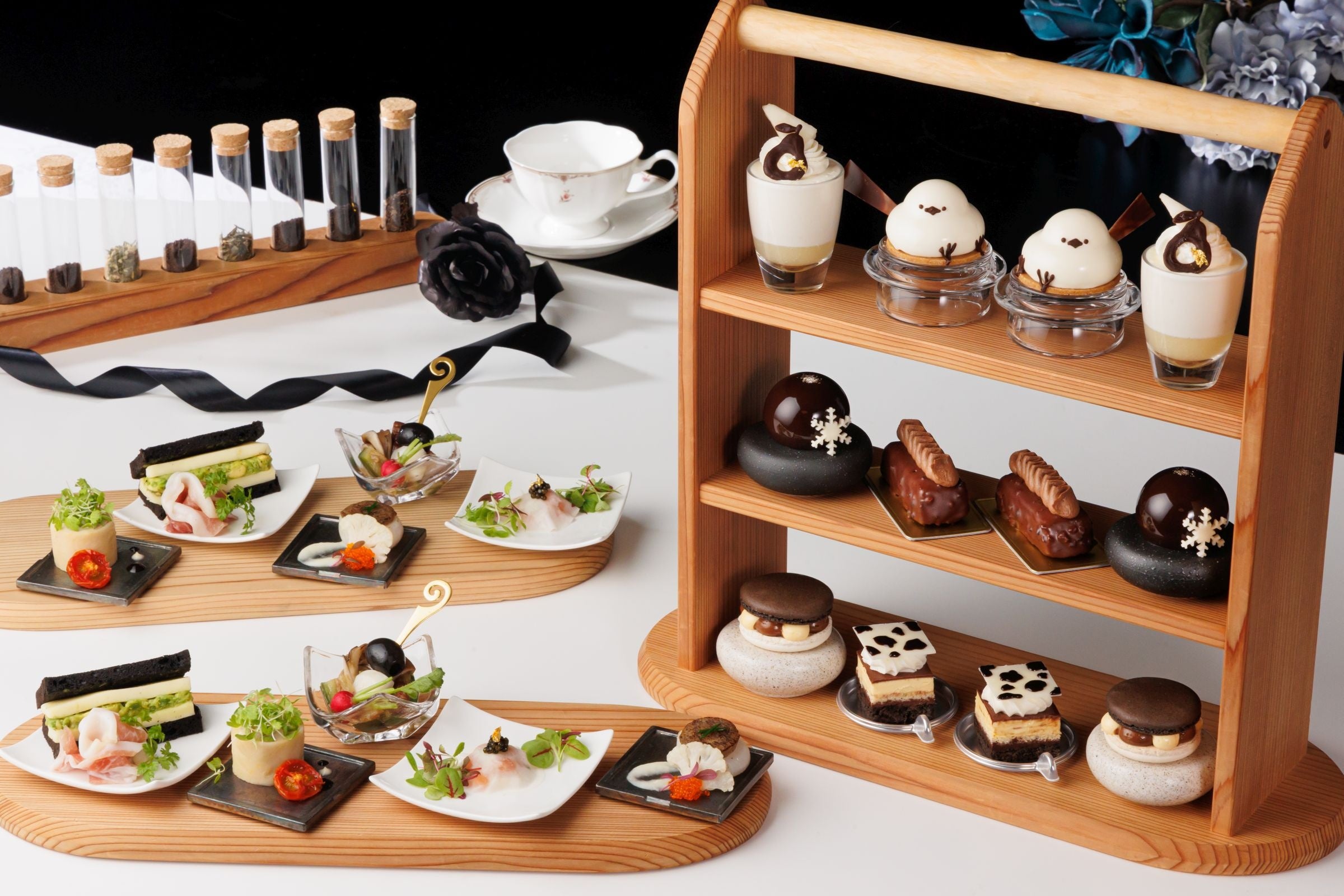 今年の「冬のアフタヌーンティー」は「白」と「黒」をテーマとしました。自然哲学の思想である五行思想において、冬は「玄冬」と言い色は「黒」があてはめられています。また、冬から連想する言葉の「雪」から「白」を選びました。スイーツは昨年好評であった「シマエナガ」や「雪の結晶」をモチーフに、セイボリーは「春の芽吹きを待つ」植物をイメージし、吉野杉の木肌が醸し出す「温かさ」を大地に見立てています。この機会にぜひ冬のアフタヌーンティーお楽しみください。