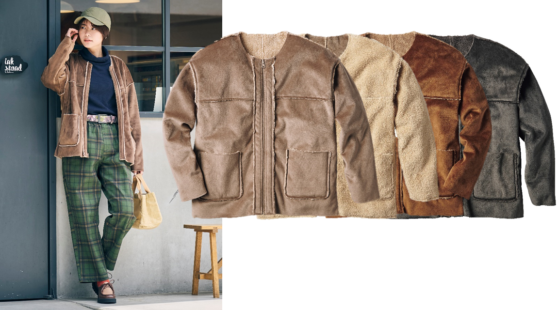 ・防風ベロアシャギーショート 1900円 サイズ:M~LL カラー:左から モカ×ベージュ、ブラウン×モカ、グレー×チャコール