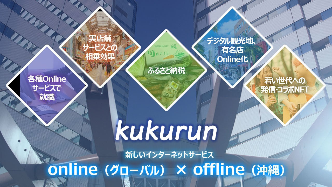 総合プラットフォーム「kukurun」ではNFTを含むオンラインサービスと現地提携店舗等で利用可能なオフラインサービスの活用でWeb3.0と実店舗を繋ぎ、沖縄県への観光促進を図るほか、NFT×現地名産品のふるさと納税やNFTの売上の使い道として首里城再建への寄付、さらに現地オフライン事業のオンライン化サポートを行うなど、kukurunを通じた様々なサービスにより観光促進、地方経済振興を進めて参ります。