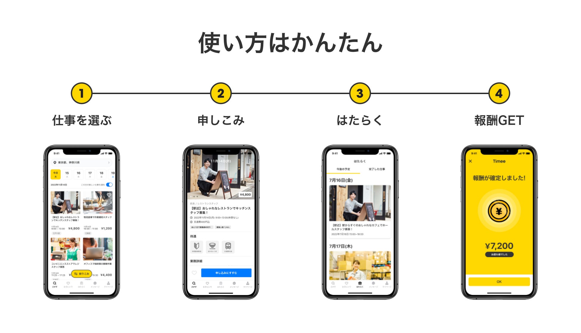 タイミーは「働きたい時間」と「働いてほしい時間」をマッチングするスキマバイトサービスです。働き手は、働きたい案件を選ぶだけで、応募・面接無しですぐに働くことができ、勤務終了後すぐにお金を受け取ることができます。 事業者は、来て欲しい時間や求めるスキルを設定するだけで、条件にあった働き手が自動的にマッチングします。