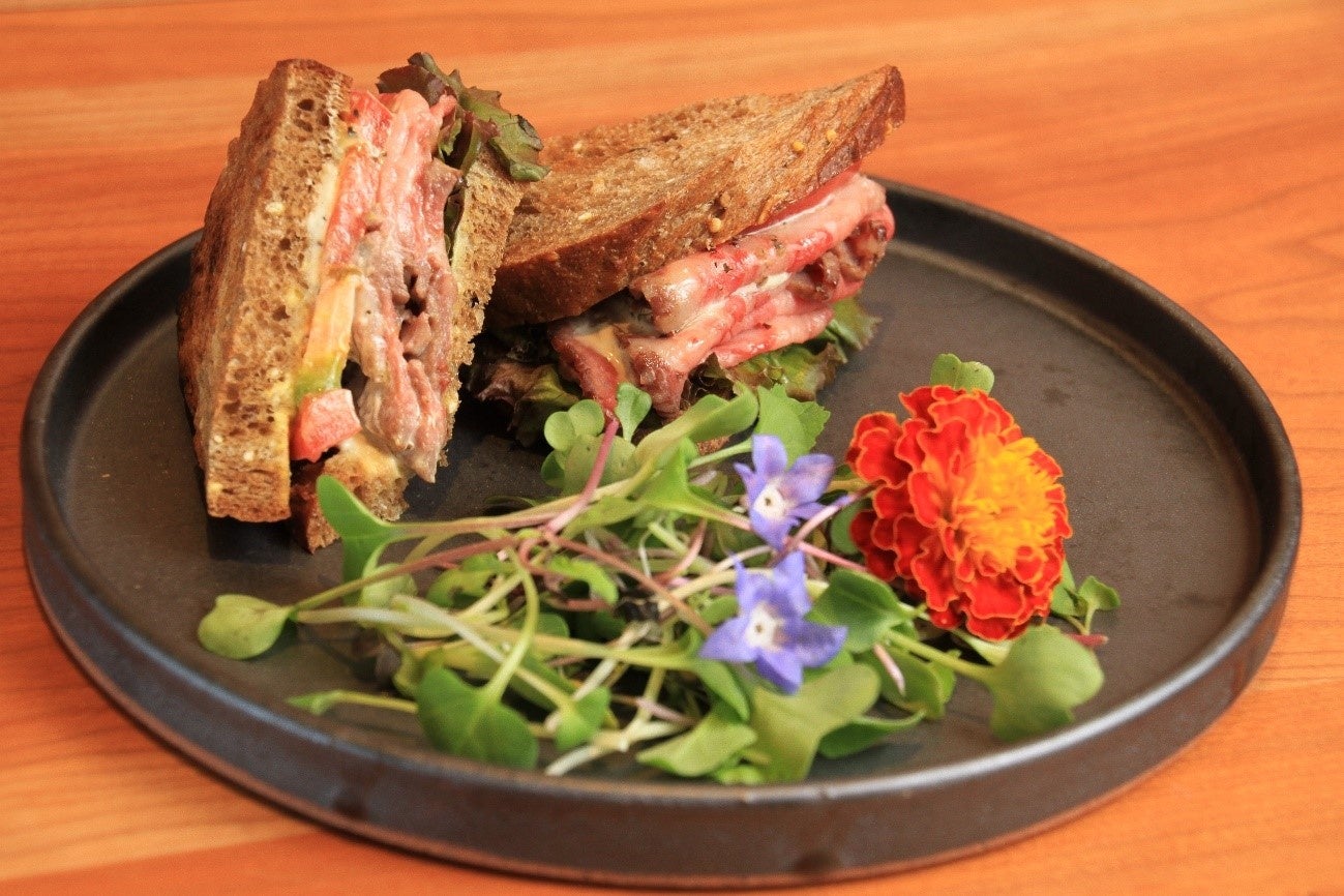 (絶妙な味わいのヨーグルトソースと自家製ローストビーフを使用したサンドイッチ)