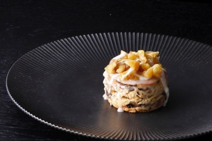 ほどよい甘味が特徴の渋皮煮の栗や甘くふっくらとした黒豆を、強力粉と薄力粉ブレンドした生地に混ぜ込んで焼き上げました。上部にほくほく栗と呼ばれる黄栗をトッピングした、旬を味わう、まさに季節の一品です。