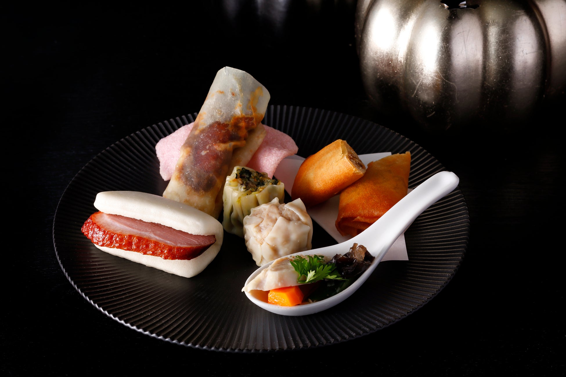 (左奥より時計回りに)北京ダック、飲茶二種、ニューオータニ特製春巻き、鶏の和え物山椒風味、スモークダックの蒸しパン包み