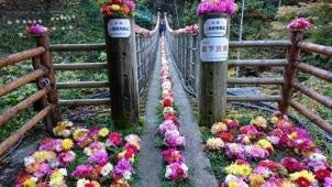 5千株のダリアが彩る「両神山麓花の郷ダリア園」で摘み取ったダリアを吊り橋に飾り付けたり、渓谷の滝の周りに敷きつめたりするなど、紅葉で色づく渓谷を彩ります。
