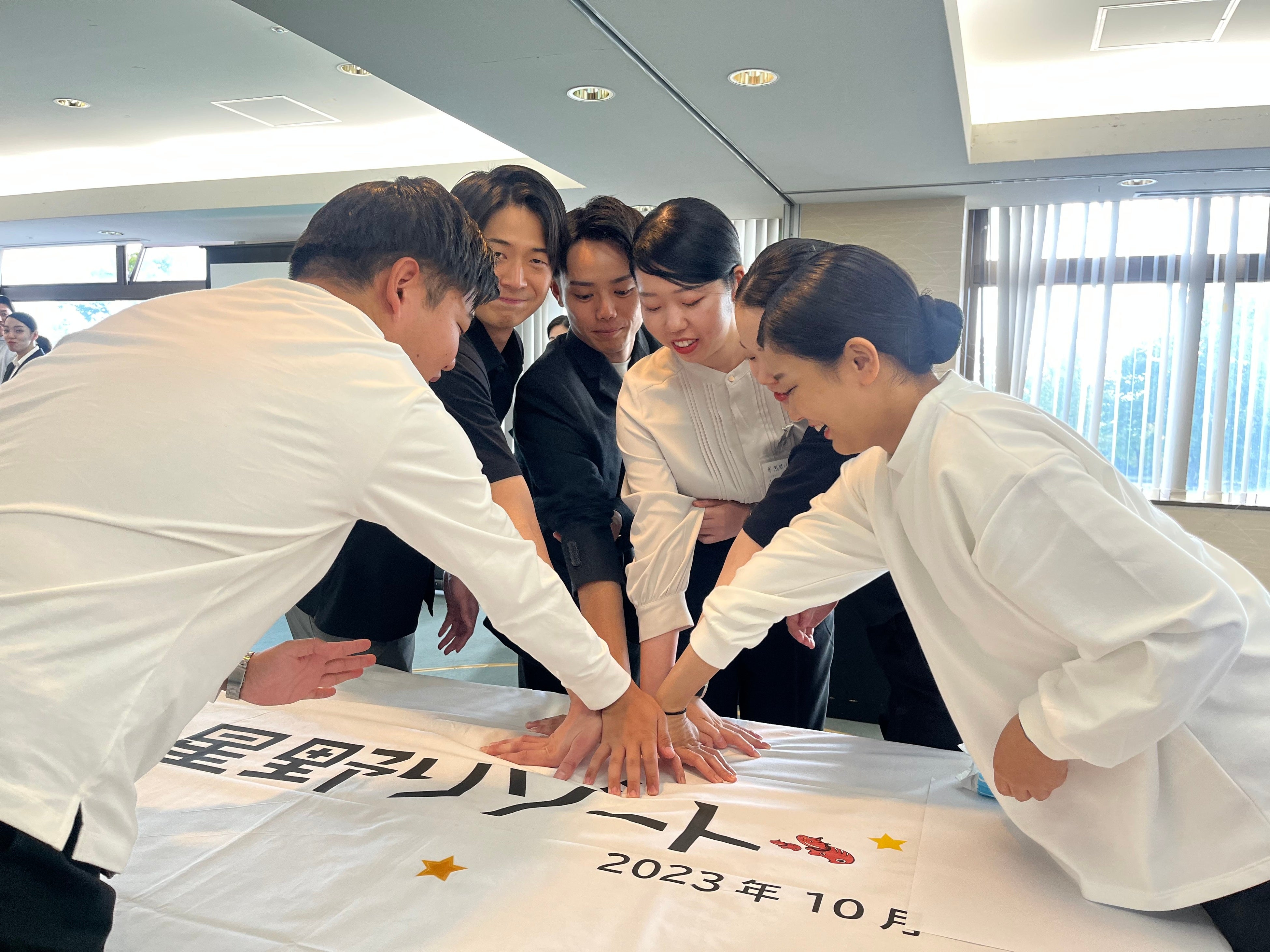 2003年の入社式より恒例となっている「契りの会」では、代表の星野佳路と配属施設の総支配人がオンラインで新入社員にエールを送った後、歓迎の川柳が詠まれました。新入社員は返歌で入社への意気込みを表現した後、手のひらを絵具に浸し、手形を押す「契りの手形」を交わしました。「契りの手形」では、当社が社員に対し、法律上の雇用関係だけでなく雇用主と雇用者の関係を超えて社員を助けるという約束と、社員が研修で学ぶ組織文化に寄与するという約束を交わします。