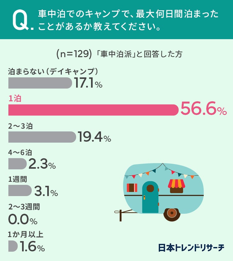 同時に「車中泊派」と回答した方にも、車中泊でのキャンプで、最大何日間泊まったことがあるか聞いてみました。