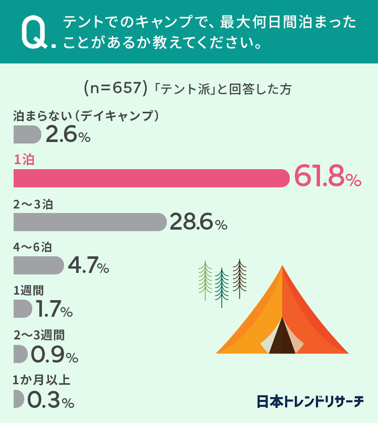また「テント派」と回答した方に、テントでのキャンプで最大何日間泊まったことがあるか聞いてみました。
