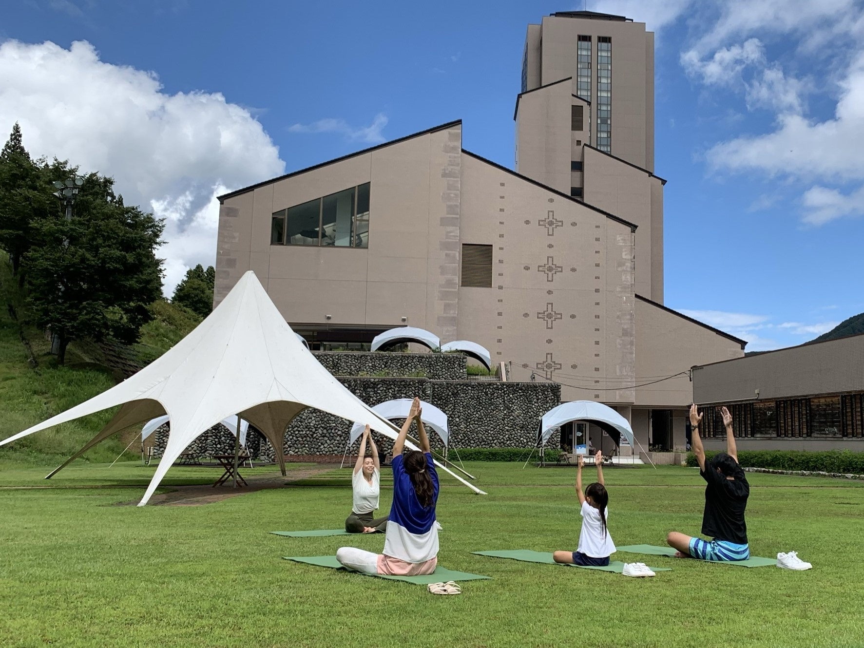 コロナ禍だった2021年春より、地元の皆さまと越後湯沢を訪れる皆さまの健康に寄与したいという思いから、NASPAニューオータニではグリーンシーズンのゲレンデを利用し、屋外でできる朝ヨガイベントを開催してまいりました。