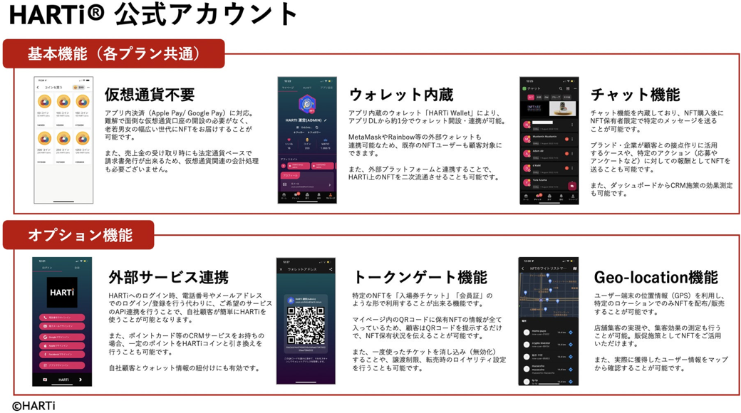 国内発のアプリ型NFTプラットフォームとして、2022年4月よりサービスを開始してからユーザーが8,000名を超える完全審査制NFTアプリ「HARTi®」の開発・運営ならびに、法人向けNFTコンサルティング事業「HARTi for Business」の2事業を主軸に事業展開。このアプリは、仮想通貨不要でNFTを購入できる機能や、アプリ内ウォレット「HARTi Wallet」を最短30秒で作成できる機能を中心に、初心者や知識の少ない方でも扱いやすいNFTの流通(無償配布・販売)機能を提供しています。法人向けのNFTコンサルティング事業では、単なるIPのNFT化だけでなく、Web3文脈の形成や、マーケット・チェーンの選定支援など、クリプトネイティブに届けるプロジェクトの創出を一気通貫にサポートしています。