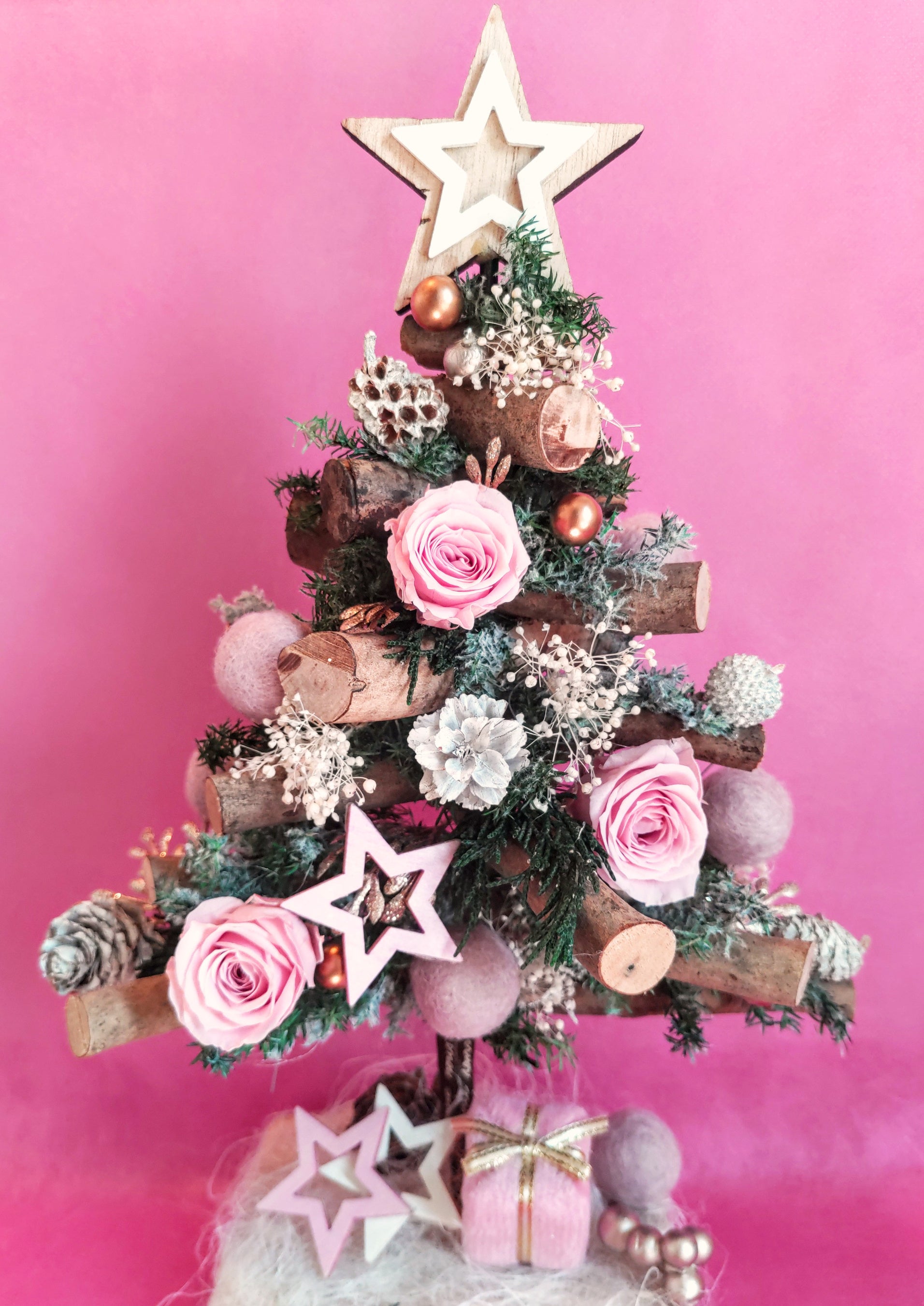 木の枝で作られたクリスマスツリーにオーナメントはウール素材の柔らかな雰囲気。