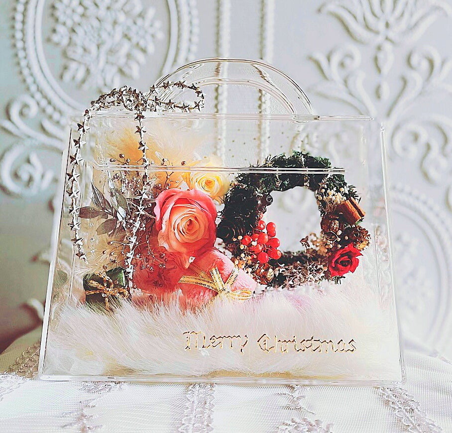 可愛いバッグ型の中に、ふわふわ素材とミニリース、プリザードフラワーを飾り、