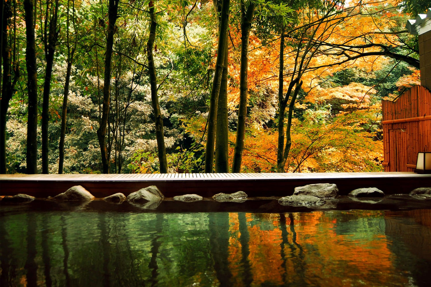 北陸随一の景勝地と名高い「こおろぎ橋」すぐ、全室リバービューの湯宿。温泉大浴場や露天風呂、ロビー、客室、レストランから「鶴仙渓」を一望し、四季折々の情景をゆったりとご覧いただけます。