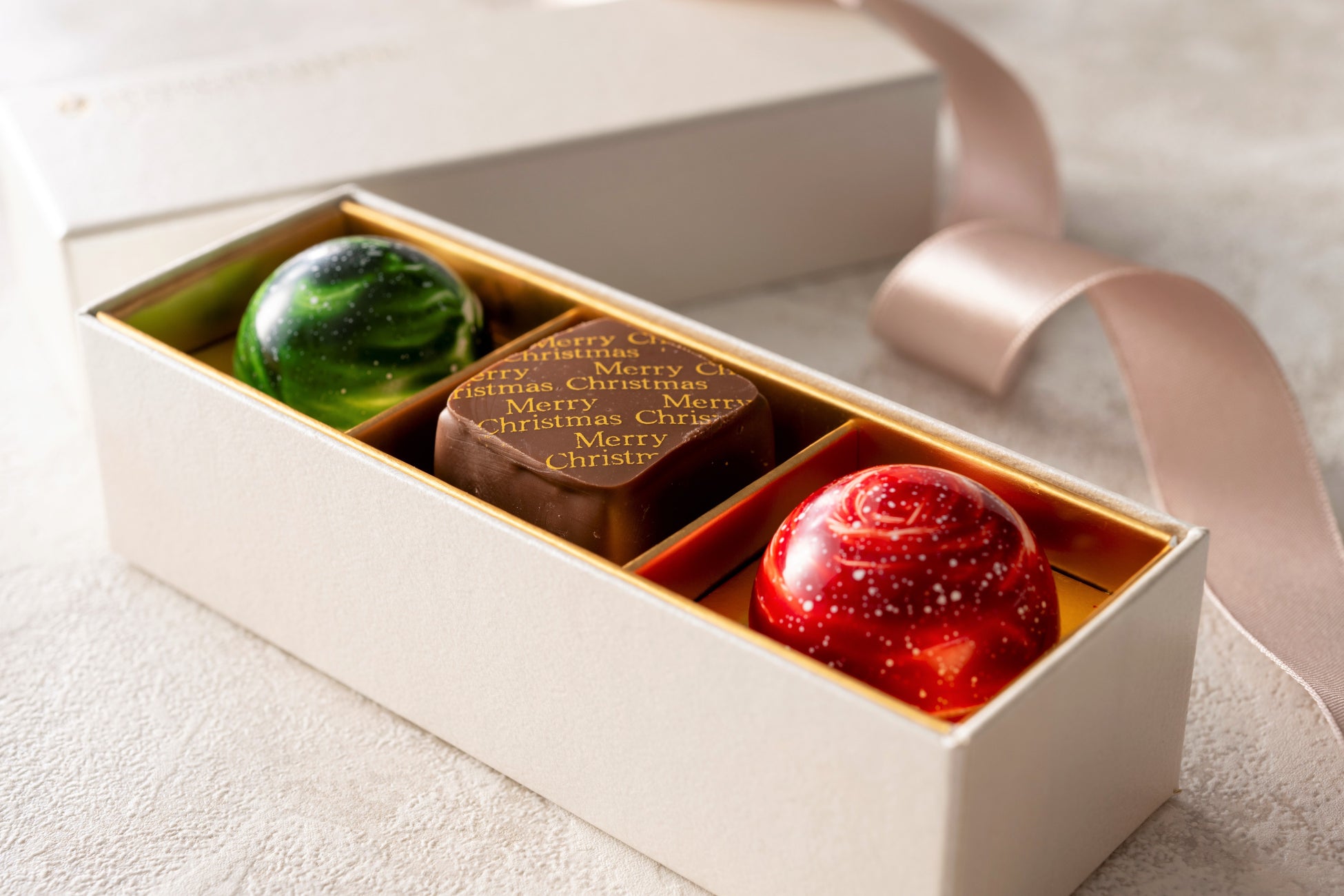 ホテルのショコラティエがひとつひとつ丁寧に作り上げる、濃厚で口どけ滑らかなボンボンショコラにクリスマス限定フレーバー3種が登場。繊細な甘みとエレガントな香りが広がる「シャンパン」、ラズベリーの甘酸っぱさがバニラの優しい甘みを引き立てる「ラズベリーバニラ」、レモンチェッロの爽やかな味わいが際立つ「プラリネシトロン」と、いずれもフェスティブシーズンならではの華やかなフレーバーが揃います。